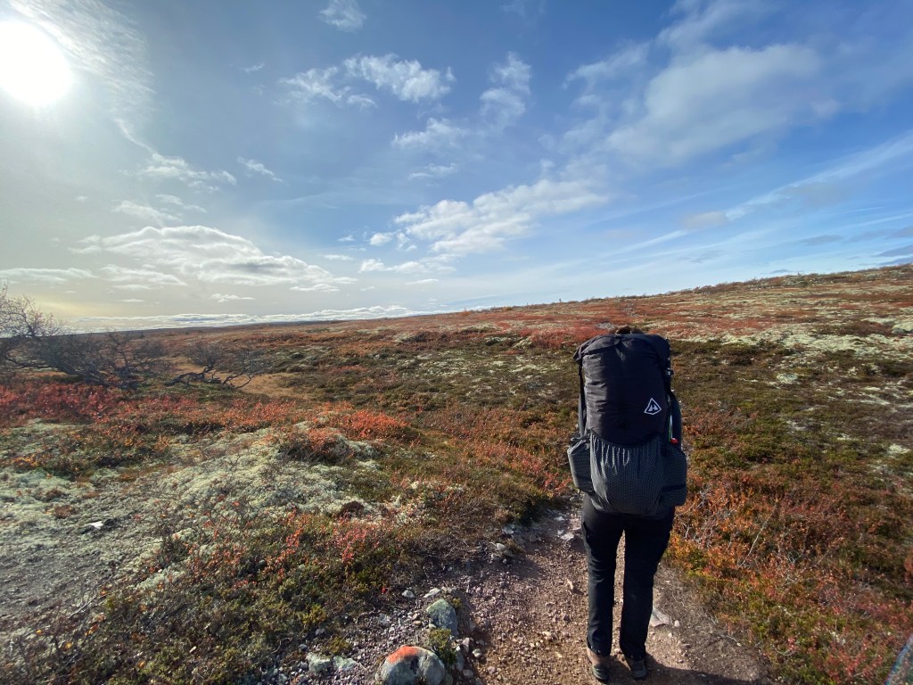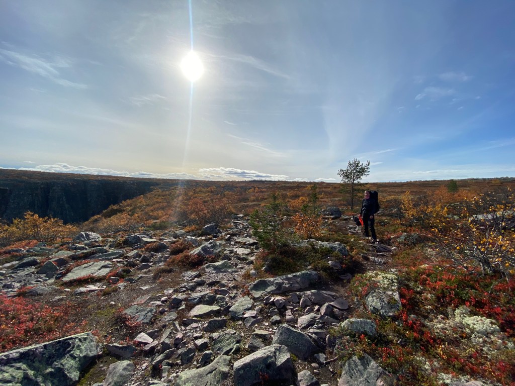 Am nächsten Morgen weckte uns ein strahlender Sonnenschein und wir wurden bald unruhig und machten uns mit gepacktem Rucksack auf Richtung Fulufjället. Das gute Septemberwetter wollten anscheinend noch ganz viele Tagesausflügler ausnutzen und den höchsten Wasserfall Schwedens den Njupeskär mit 125 m besuchen, der vom Parkplatz aus, auf kurzem Wege recht bequem zu erreichen ist. Also schoben wir 3 uns schwer bepackt an den Sonntagsausflüglern vorbei, schossen schnell ein paar Fotos am besagten Wasserfall und stiegen dann den recht steilen Weg hoch in das Fulufjlället auf. Der Weg war im oberen Drittel sehr steinig und verblockt, sodass wir einige Male Mack mit seinem Rucksack anschieben mussten, weil er festgeklemmte oder die großen Steine mit seinem Rucksack nicht hochkam. Wir hatten unseren Spaß und Mack sorgte für einige Lacher.
