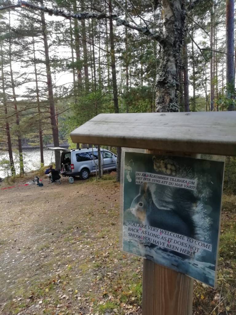 Am nächsten Tag versuchten wir unsere Ausrüstung zumindest einigermaßen zu trocknen und nutzten dazu jede kurze Regenpause und sonnige Wolkenlücke aus. Wir verbrachten noch eine ruhige Nacht auf „unserem“ Lagerplatz und machten uns langsam auf den Rückweg, nicht ohne noch einige kleinere Wanderungen zu unternehmen. Am vorletzten Abend schliefen wir auf einem großen leeren Waldparkplatz in der Nähe eines Naturschutzgebietes mit gemütlicher Hütte, Bänken und Plumpsklo. Wir verbrachten die Nacht völlig ungestört und sehr ruhig, bis wir morgens früh um 7 Uhr von Autos geweckt wurden die mehr und mehr auf den Parkplatz strömten. Zunächst dachten wir, es würden sich um Jogger handeln und blieben einfach liegen. Als aber der gesamte Parkplatz mit mindestens 40 Autos komplett zugestellt war und eine Gruppe von Leuten recht dicht an unserem Auto stand und sich unterhielt, riskierte ich dann doch mal einen Blick und sah eine große Elchjagdgesellschaft die gerade die Jagd plante. Wir entschlossen uns dann einfach noch etwas liegenzubleiben… den verstörenden Anblick eines verschlafen dreinblickenden bärtigen Kerls, der ihnen in Unterhose zuwinkt, wollte ich ihnen dann doch nicht zumuten. Wir wollen schließlich noch mal wieder kommen ;-). Nachdem die Jagdgesellschaft losgezogen war und wir gefrühstückt hatten, fuhren wir Richtung Trelleborg.