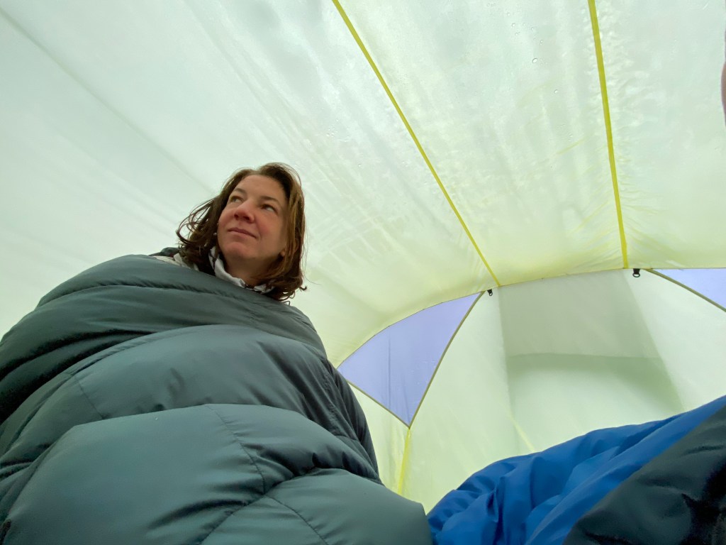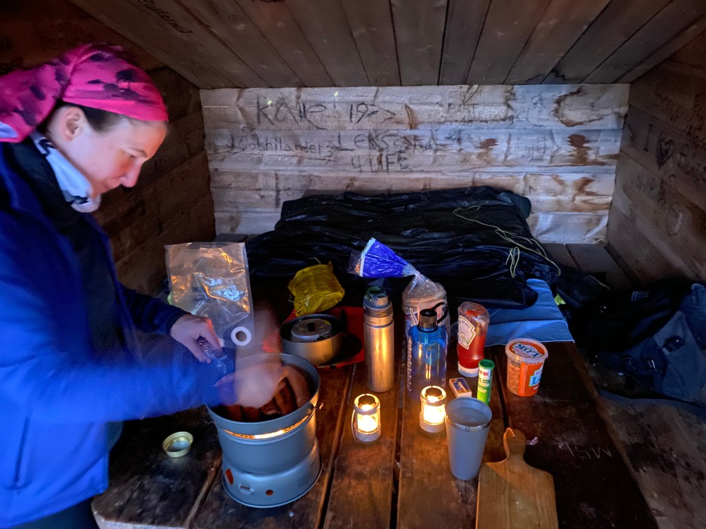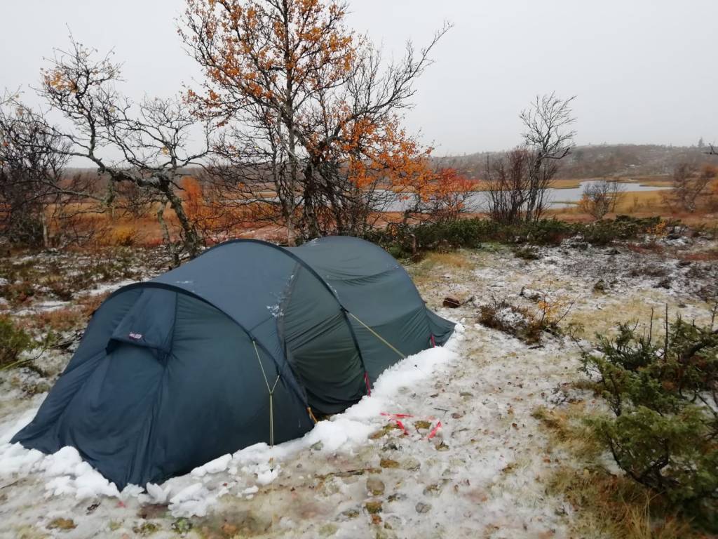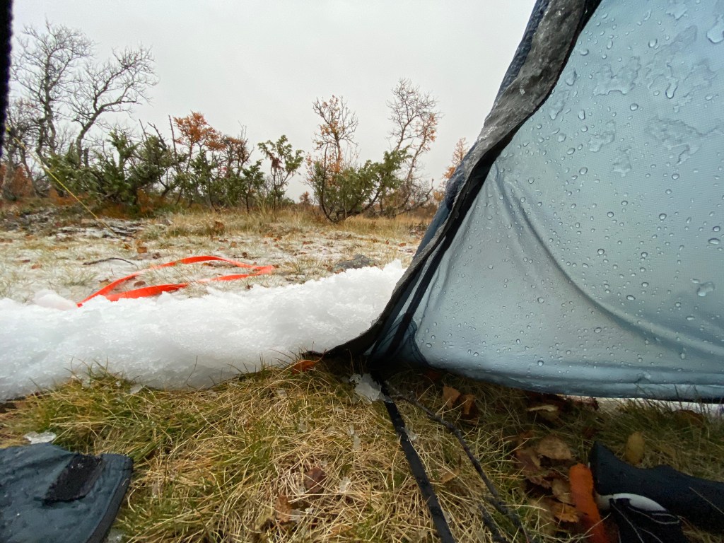 Wir erwachten morgens recht früh von starkem Regen, Schnee und Sturm der nachts bereits eingesetzt hatte. Unser Zelt hing stark durch und es hatte sich einiges an nassem Schnee auf dem Zelt gesammelt, dass wir erst mal davon befreien, mußten. Ein kurzer Blick auf den Wetterbericht zeigte uns das, dass Wetter den ganzen Tag nicht besser werden würde und uns mit Dauerregen, Schneeregen und Sturmböen bis 90 km/h verwöhnen würde. Also machten wir das beste daraus und schliefen noch eine Runde, kochten uns in der Apsis einen Kaffee und faulenzten den Tag gemütlich im Zelt und wärmten uns in der Schutzhütte auf. Heute sollte es für uns nicht mehr weitergehen. Obwohl ich doch so einiges gewohnt bin, hatte ich so ein mieses Wetter dann doch noch nicht erlebt… Zum Schluss sollte es ganze 16Std. durch geregnet haben. Unser Zelt hat dies super ausgehalten und wir blieben trocken, obwohl unser Außenzelt komplett nass war und sich tiefe Pfützen unter dem Zeltboden gesammelt hatten.