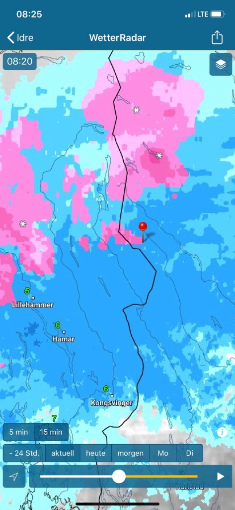 Je weiter der Tag voran schritt, desto schlechter wurde, wie angedroht, das Wetter und wir fuhren langsam zurück zu einem weiteren abgelegenen Lagerplatz nicht, ohne zuvor noch zum See in Grövelsjön zu fahren und die nicht ganz so alte Holzkirche zu besuchen. Den Abend ließen wir entspannt beim Lagerfeuer und einem Gin (es war Mittwoch bzw. traditionell Ginwoch ) geschützt in einem überdachten Windschutz ausklingen. Der Morgen begann stürmisch mit kräftigen Regenschauern und der Wetterbericht verhieß nichts Gutes. Es sollte den ganzen Tag durch regnen und die dichten Wolken hingen tief am Himmel. Am nächsten Tag sollte es aber sonnig und warm werden bis danach die nächste Schlechtwetterfront aufziehen sollte. Es war die erste Tour ins nordische Fjell für Insa und da ein Tourstart bei so einem Wetter meist keine guten Voraussetzungen für hoffentlich zukünftige Touren sind, beschlossen wir kurzerhand, den Tourstart um einen Tag zu verschieben. Also lagen wir dick eingepackt und gemütlich im Caddy und verbrachten den Tag schlafend und lesend und sogar Mack hatte bei dem Mistwetter keine Lust rauszugehen.