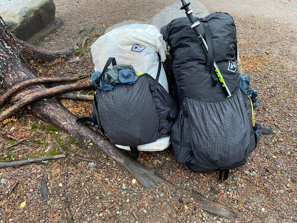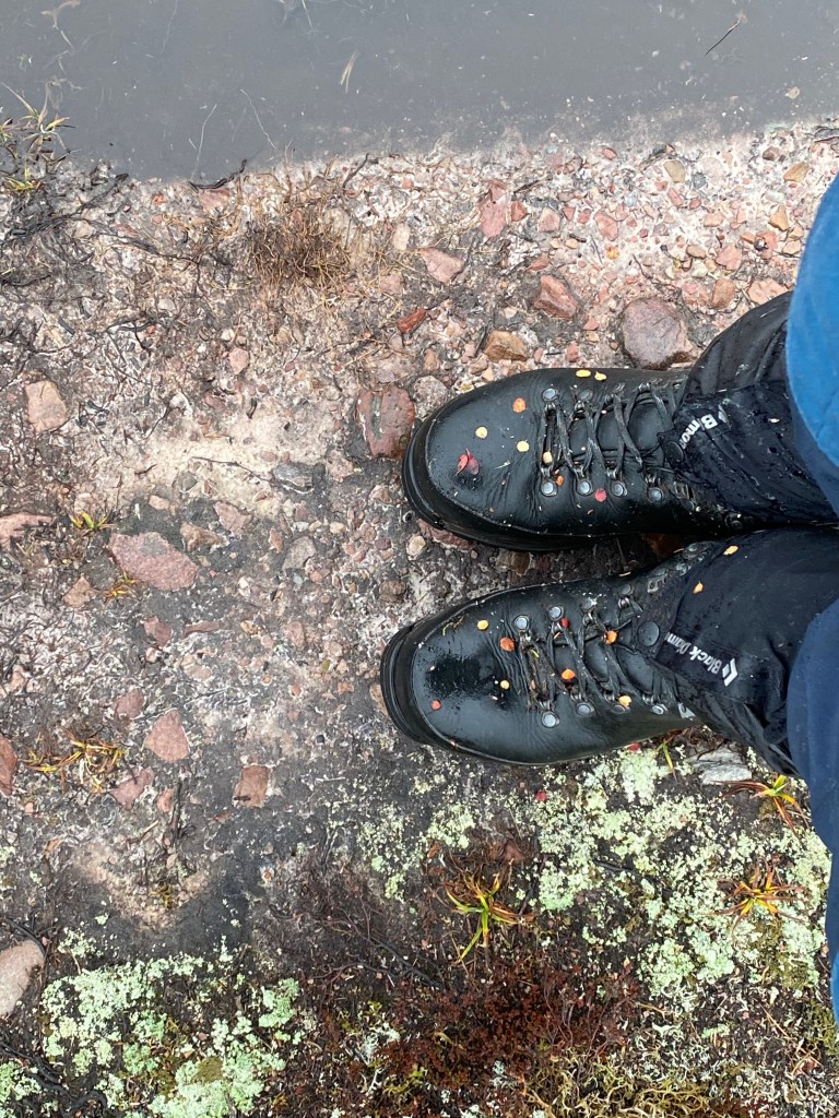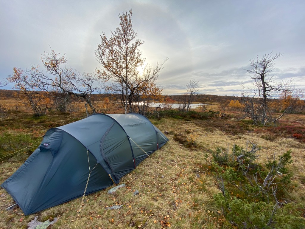 Am nächsten Morgen hatte der Regen nachgelassen und wir beschlossen recht zeitig aufzubrechen und den Rückweg anzutreten, da am Nachmittag bereits die nächste Sturmfront aufziehen sollte und die nächsten Tage anhalten keine Besserung versprachen. Das nasse Zelt wurde daher nur grob zusammengelegt und in der Außentasche des Rucksacks verstaut und wir machten uns gemütlich im nass nebeligen Wetter auf den Rückweg über die Rösjöstugorna Hütte zum Auto zurück. Zufälligerweise wollte an dem Tag ein guter Freund von uns, der Rainer vom Outdoorgeschäft „Der Skandinavier in Coburg“ in Grövelsjön zu einer kleinen Tour starten und wir verabredeten uns kurzerhand, um ihn dort zu treffen. Die Freude war riesig. Wir hatten uns schon ein halbes Jahr nicht mehr gesehen, damals auch in Schweden und wir hatten uns einiges erzählen. Wir verbrachten den restlichen Nachmittag also mit leckeren Waffeln, Pancakes und guten Gesprächen bis wir abends Richtung einem Lagerplatz aufbrachen und Rainer in sein Zelt schlüpfte da er morgens früh aufbrechen wollte.