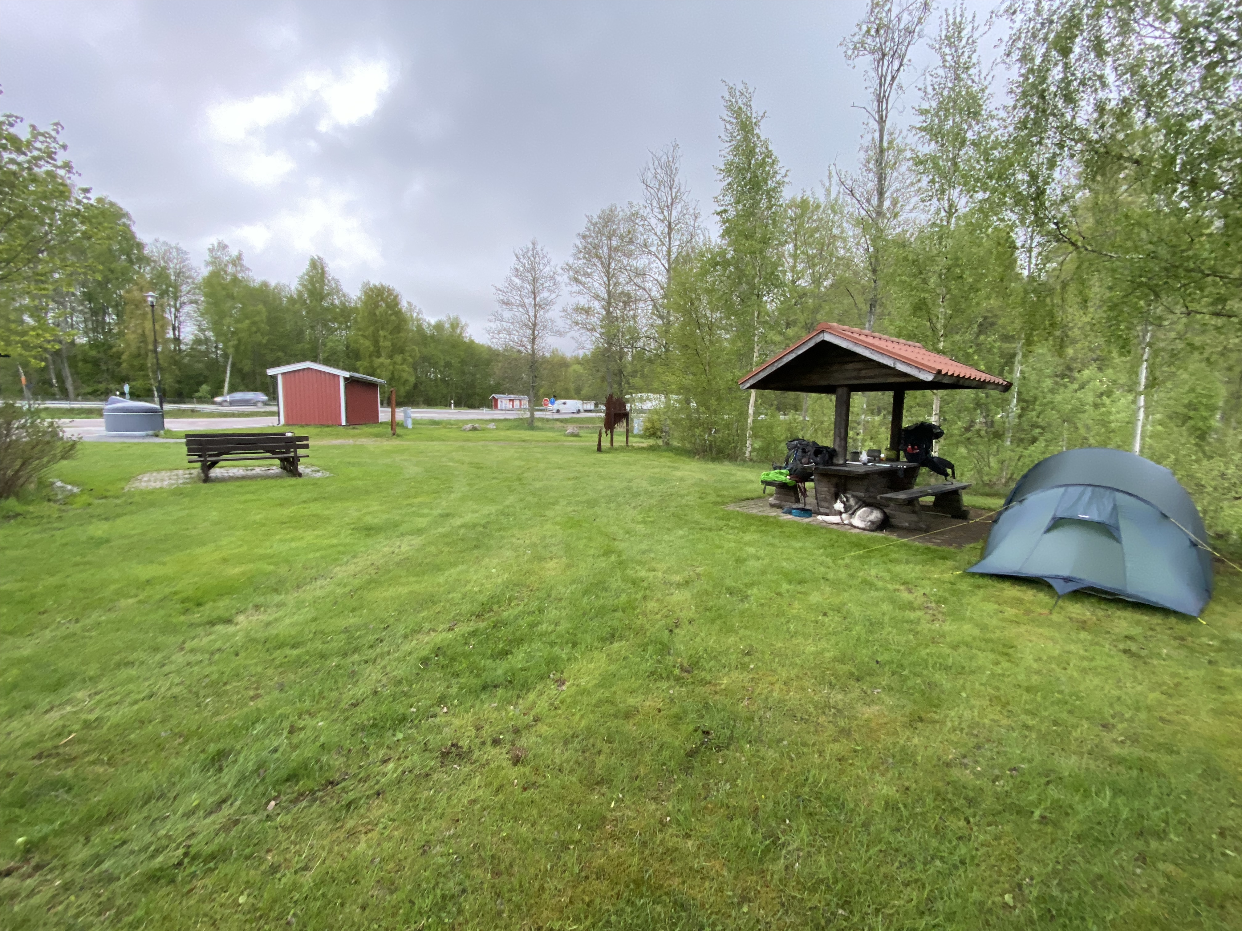 Der Zeltplatz war dann vom allerfeinsten! Kurz geschnittenes Gras, Wasser und Sanitäre Einrichtungen 10 Meter entfernt und direkt neben unserem Zelt eine überdachte Sitzmöglichkeit. Was man halt von einem Autorastplatz direkt neben der Autobahn erwarten darf! Zudem fing es am Nachmittag noch kräftig an zu regnen, so dass wir eine feucht, laute Nacht mit wenig Schlaf verbrachten. Zum Abendessen gab es noch eine Kartoffelsuppe aus der Tüte…
