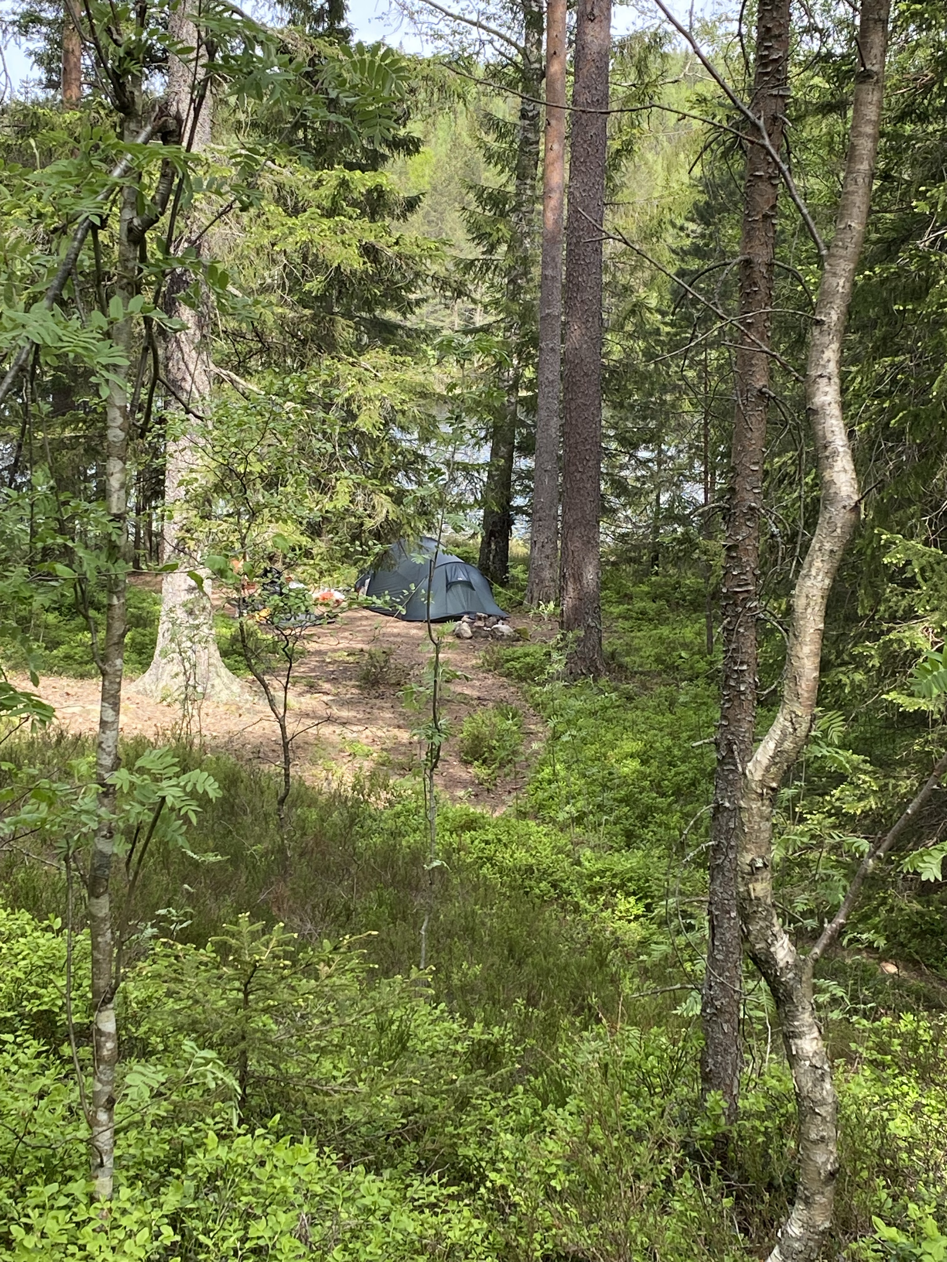 So konnten wir bei bestem Wetter wieder entspannt und gut gestärkt weiter auf den Bergslagsleden wandern. Der Bus ließ uns direkt an der Autobahn aussteigen und nach einigen Kilometern an der Straße entlang und einigen zu bezwingenden Hügeln mit ordentlich morastigen Passagen kamen wir zu einem herrlichen Shelter an einem See an dem wir die Nacht verbringen wollten. Leider hatte mittlerweile die Mückensaison angefangen, so dass wir nicht mehr in dem Shelter schlafen konnten/wollten, sondern direkt dahinter unser Zelt aufbauten. Bis auf das stetige Summen der Mücken verbrachten wir eine ruhige Nacht und machten uns morgens recht spät auf die nächste Etappe. Wir waren sehr froh, wieder unterwegs zu sein und die Ruhe der Natur wieder genießen zu können. Die Etappe versprach schön zu werden und an unserem geplanten Ziel sollte es einige Shelter und auch einen Campingplatz geben. Wir wanderten den ganzen Tag bei bestem Wetter und ohne eine Menschenseele zu sehen bis in die Nähe unseres Ziels in Anneboda. Als wir dort ankamen traf uns fast der Schlag alles war voll von Menschen. An jedem Shelter wurde gegrillt und es gab absolut keinen ruhigen freien Platz, um ein Zelt aufschlagen zu können. Wir waren total überfordert mit diesem Andrang und wurden immer frustrierter bei unserer Stellplatzsuche. Denn wir waren wohl genau in ein städtisches Naherholungsgebiet hinein gelaufen und dazu am Wochenende bei herrlich warmen Wetter. Zudem war die Stimmung der Menschen eine ganze andere als man es sonst beim wandern erlebt. Wo sonst immer ein nettes Hej Hej ausgetauscht wird und oft genug ein kleines Schwätzchen gehalten wird, so waren hier Wochenendausflügler und Gruppen junger Männer mit tiefergelegten Autos unterwegs, die so gar keinen Sinn für ein nettes Miteinander hatten. Da wir dort nicht bleiben wollten/konnten und auch keine Lust hatten, auf den Campingplatz zu gehen, entschlossen wir uns weiter zu laufen. Ich hatte auf der Karte 2 Seen aus gemacht, wo mit Glück vielleicht etwas zu finden wäre. So machten wir uns schnell auf den Weg und fanden am Ende eines Weges, der überschwemmt war, ein vermeintlich ruhiges Plätzchen. Mit etwas ungutem Gefühl aber genug Müdigkeit durch den langen Tag schliefen wir trotz der Partymenschen in der Ferne und aufheulenden Motoren und quietschenden Reifen ein.