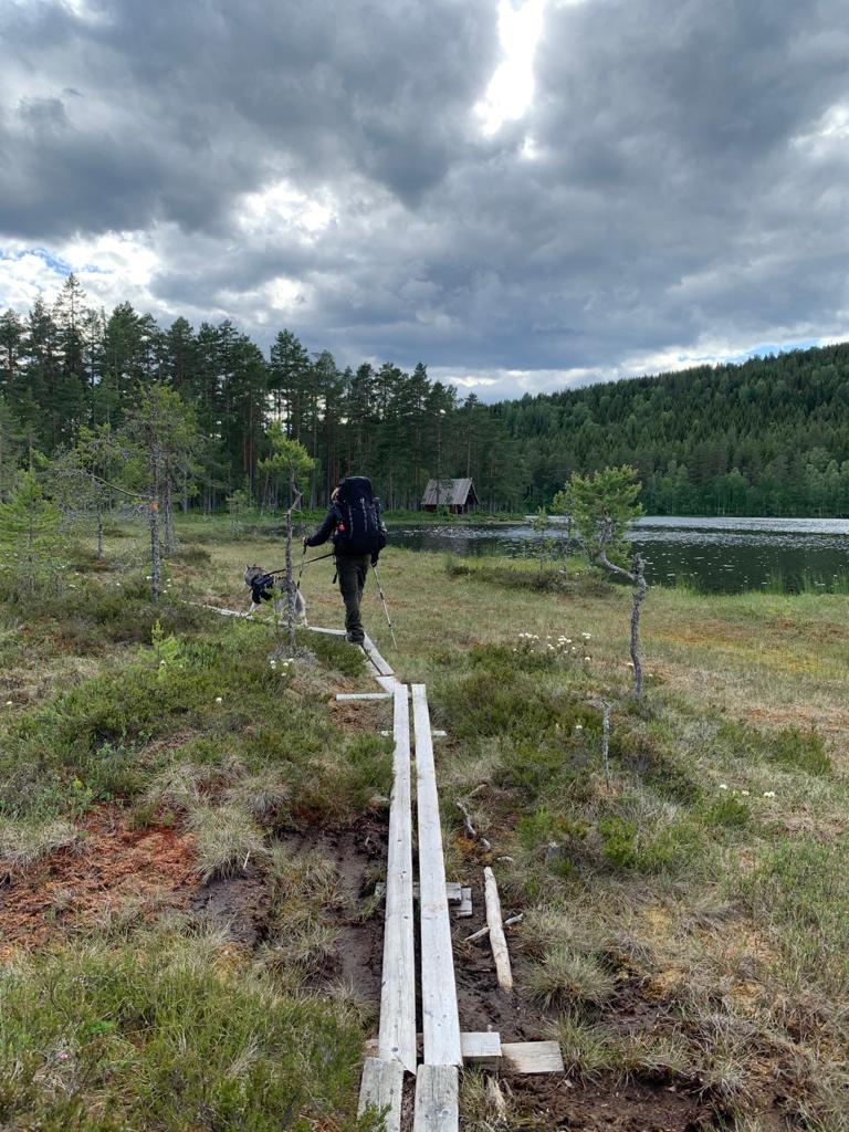 Am nächsten Morgen ging es weiter durch sehr sumpfiges und feuchtes Gebiet, sodass wir trotz der Wärme mit langer Hose und Jacke unterwegs waren. Als Tagesziel hatten wir uns einen Platz direkt an einem See auserkoren, an dem auch eine Kapelle stehen sollte. Erschöpft kamen wir am Nachmittag an besagter Kapelle an und es gab keinen Zeltplatz. Neben und hinter der Kapelle nicht und auch nicht im näheren Umland. Da wir überhaupt keine Lust mehr hatten, noch einige Kilometer weiter zu laufen und Mack wegen der Wärme und der Mücken am Tag sehr gelitten hatte, beschlossen wir die Bänke und den Tisch in der Kapelle beiseite zu schieben und unser Zelt „Gott ganz nah aufzubauen.“ Wie sich kurze Zeit später raus stellte, war es genau die richtige Entscheidung! Wir hatten gerade gegessen und gegen 18 Uhr wurden wir regelrecht von den Knots überfallen (ganz kleine Mücken), die Ohren, Nase und jede freie Hautstelle befielen. So flüchteten wir sehr früh in unser Zelt, ohne sicher 100 Stück der kleinen Knots mit rein zu bringen und die nächste halbe Stunde damit zuzubringen, diese im Zelt zu jagen. Wir schliefen dann recht früh ein…. Wie es dann manchmal so ist, musste der Hund und wir dann doch noch mal nachts raus und wir erlebten die bis dahin schönste Mitternachtssonne, die über dem See stand auf dem leichter Bodennebel strich. So hatte die frühe Flucht in unser Zelt doch etwas Gutes und wir waren uns sicher, dass niemand uns böse war, dass wir in der kleinen „Kapelle“ schliefen… Nur unsere Nachbarn die Schwalben sahen es wohl etwas anders, so mussten wir den ein oder anderen Schiss morgens von unserem Zelt wischen.