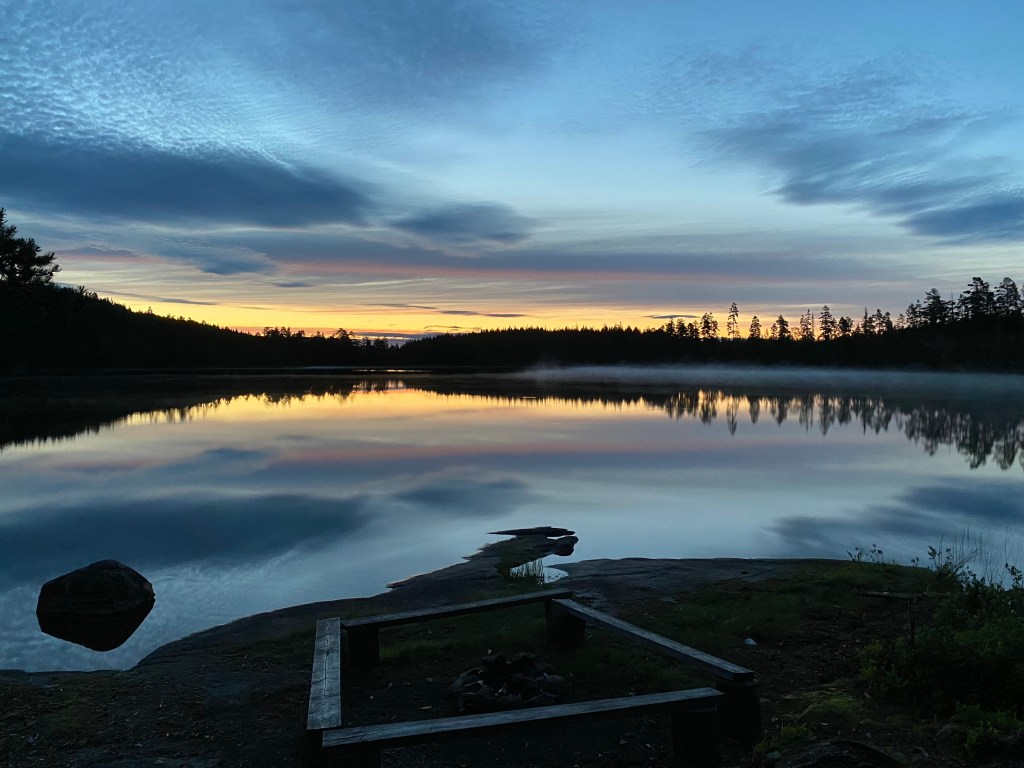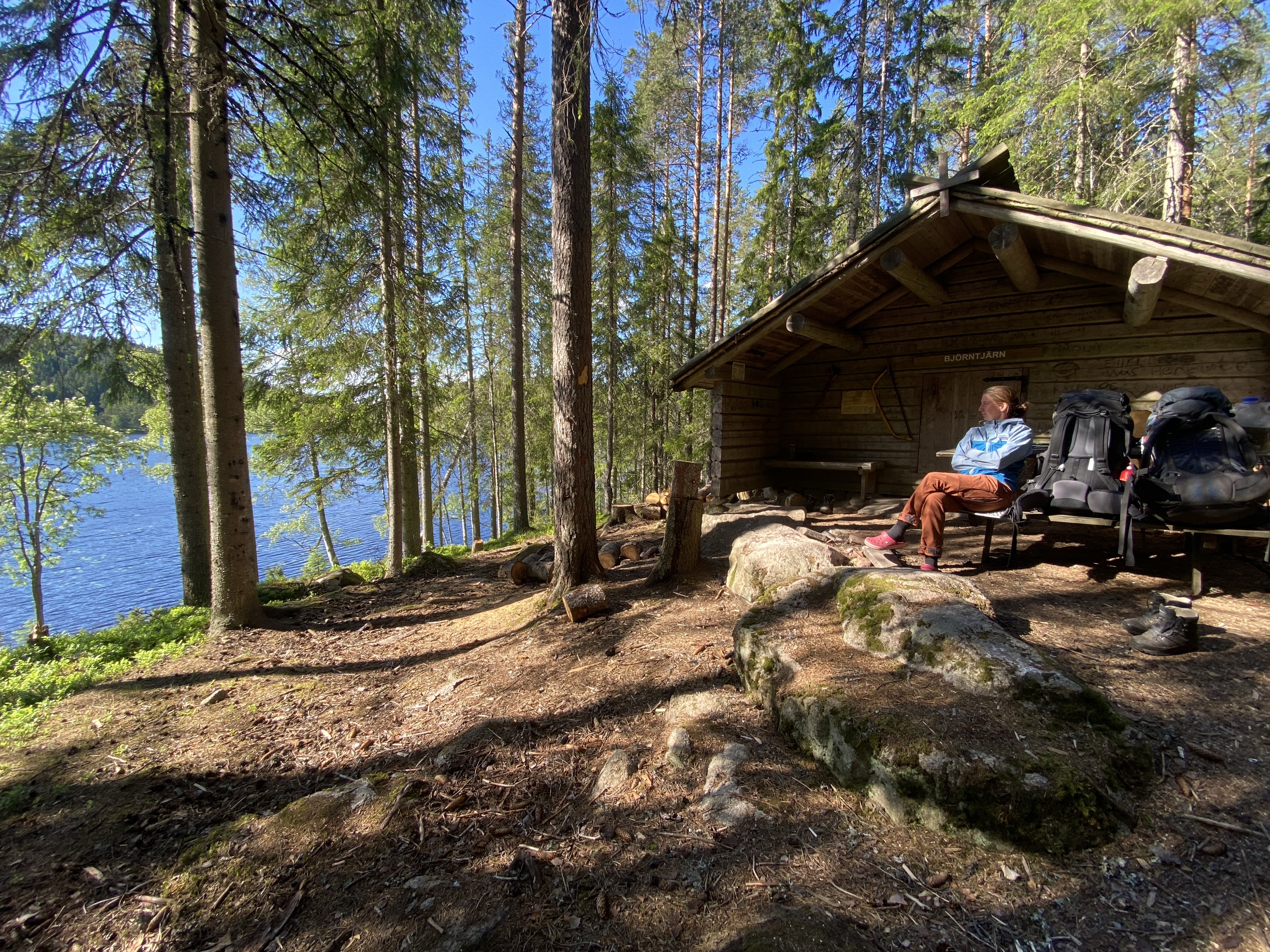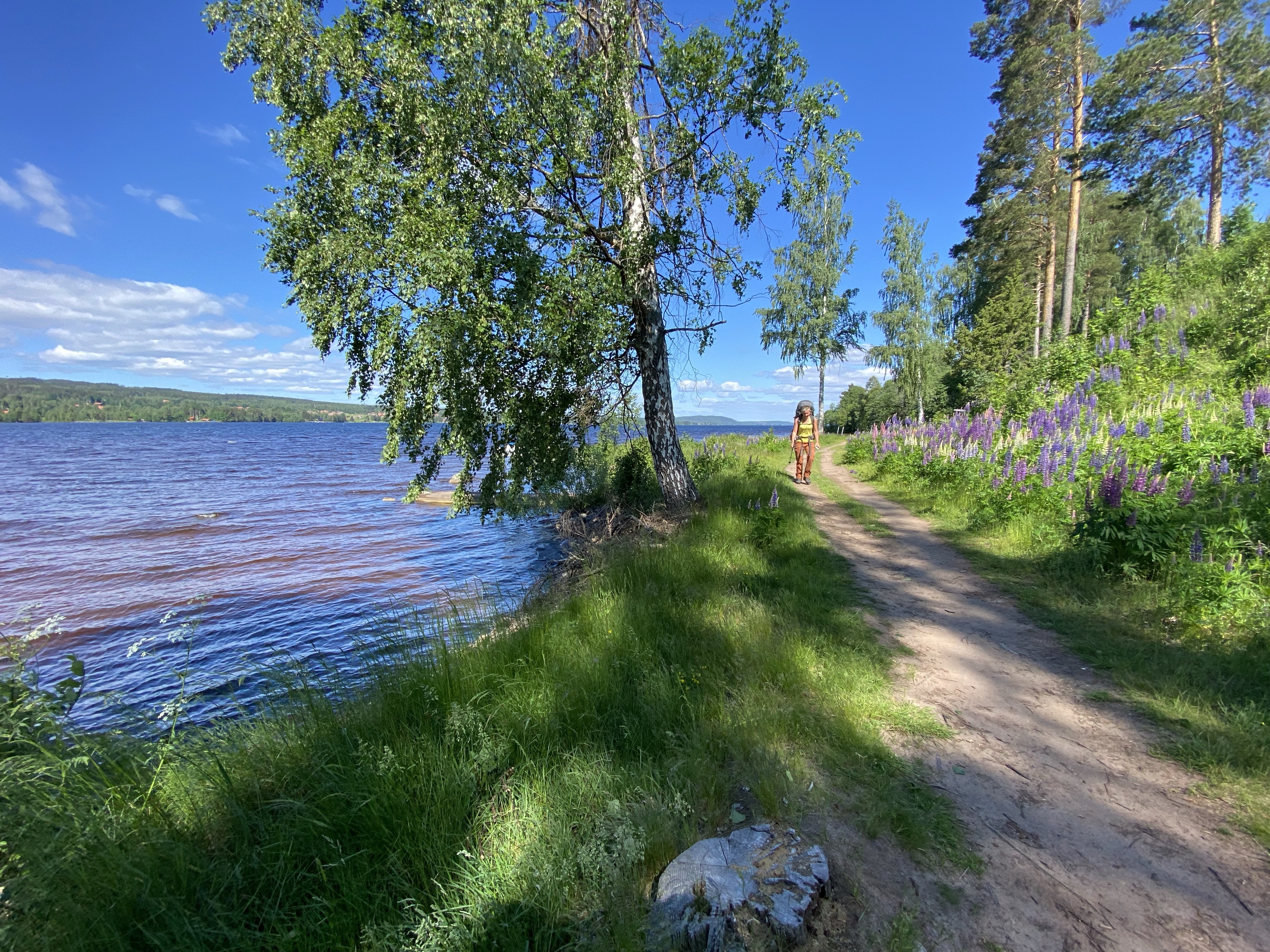 Nach ein paar Tagen Verschnaufpause bei sehr sommerlichen Temperaturen ging es frisch gewaschen und wieder gut genährt von Leksand aus auf den Siljansleden Richtung Mora. Wir sollten hier nur 4 Tage unterwegs sein, denn wir freuten uns auf Besuch aus der Heimat, den wir irgendwo auf dem Weg treffen wollten. So machten wir uns ohne viel Zeitdruck auf den Weg entlang des Siljanssees. Der Weg führte uns zunächst herrlich direkt am See entlang durch ein Meer von Blumen in den Wald herein, in dem immer wieder Schilder und Ruinen von alter Besiedlung und Arbeitstätigkeit zeugten. Insbesondere gab es in vorherigen Zeiten wohl einige Köhlerhütten in den Wälden rund um den Siljanssee. Das besondere in und um den Siljansleden sind unzählige sogenannte „Fäbod“. Dies sind frühere Almen, die aus alten Hütten und Höfen bestehen, die sehr malerisch auf den Hügelkuppen verteilt liegen und auf denen in den Sommermonaten das Vieh geweidet wurde. Anders als bei uns werden diese Almhütten nur noch als Sommerhäuser genutzt, sodass hier auch keine Brotzeit oder Kaiserschmarn zu bekommen ist. (Was wir sehr sehr schade fanden, denn Essen könnten wir ja unterwegs immer!) So verirrten wir uns auch am Ende des ersten Tages in eine, zu der Zeit komplett verlassene „Fäbod“, als wir auf der Suche nach der Übernachtungshütte falsch abgebogen waren. Nach kurzer Rast und einem weiteren Kilometer kamen wir an der Übernachtungshütte Björntjärn an. Diese traditionell erbaute Hütte, bot einige Schlafbänke, eine Feuerstelle und einen schönen Ausblick auf den angrenzenden See. So genossen wir eine herrliche Mittsommernacht und schliefen nur von wenigen Mücken geärgert in der Hütte. (Auch mal wieder schön, kein Zelt aufbauen zu müssen).