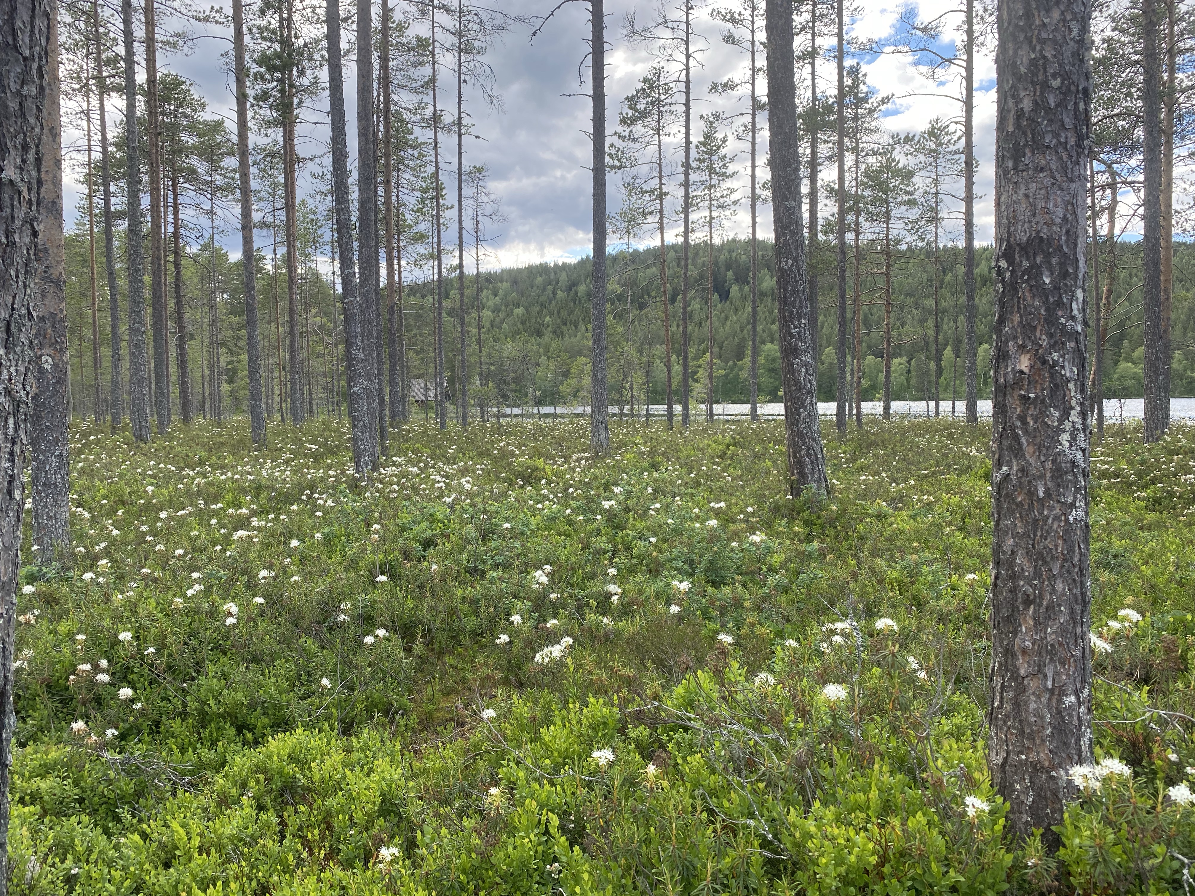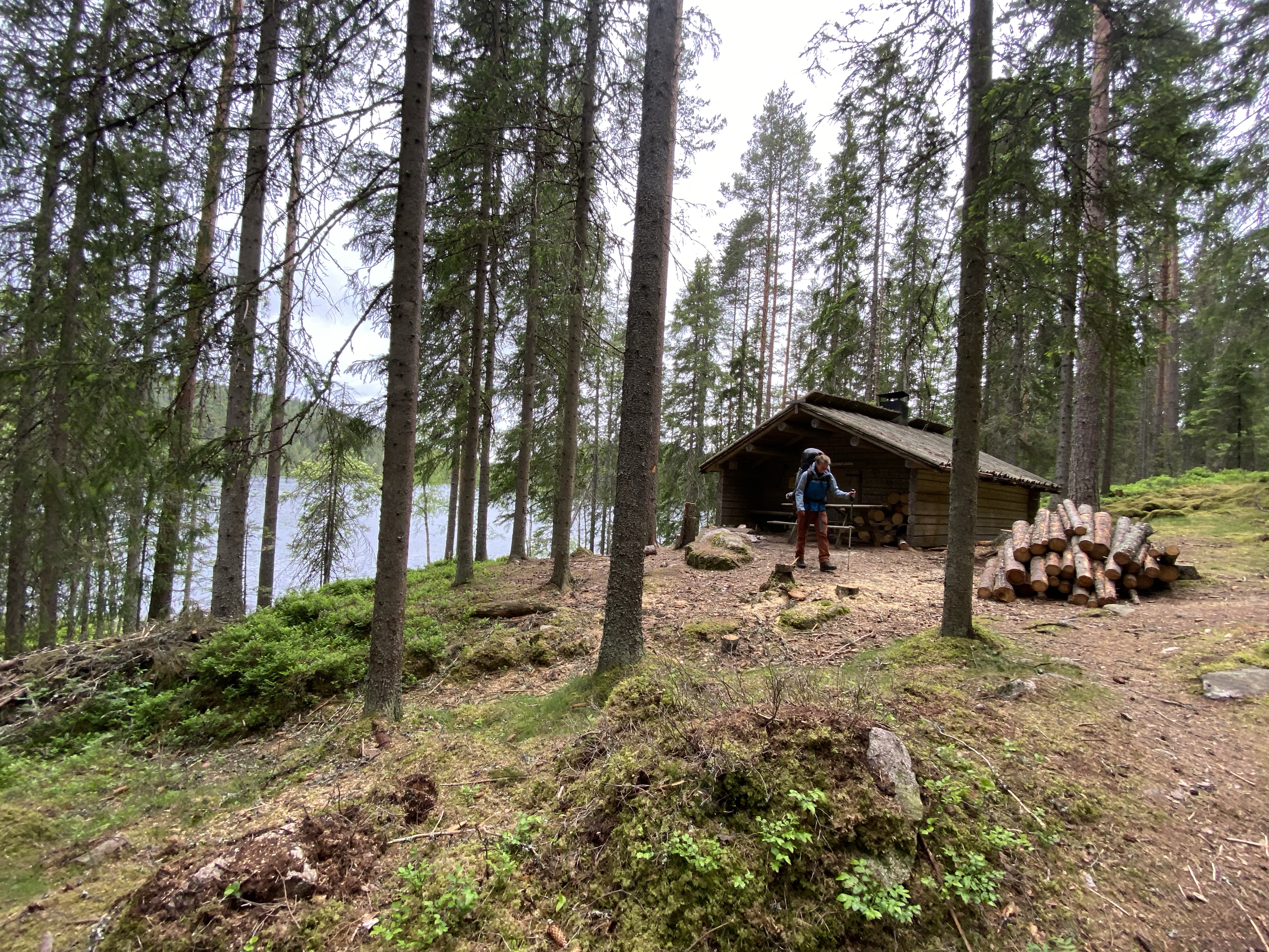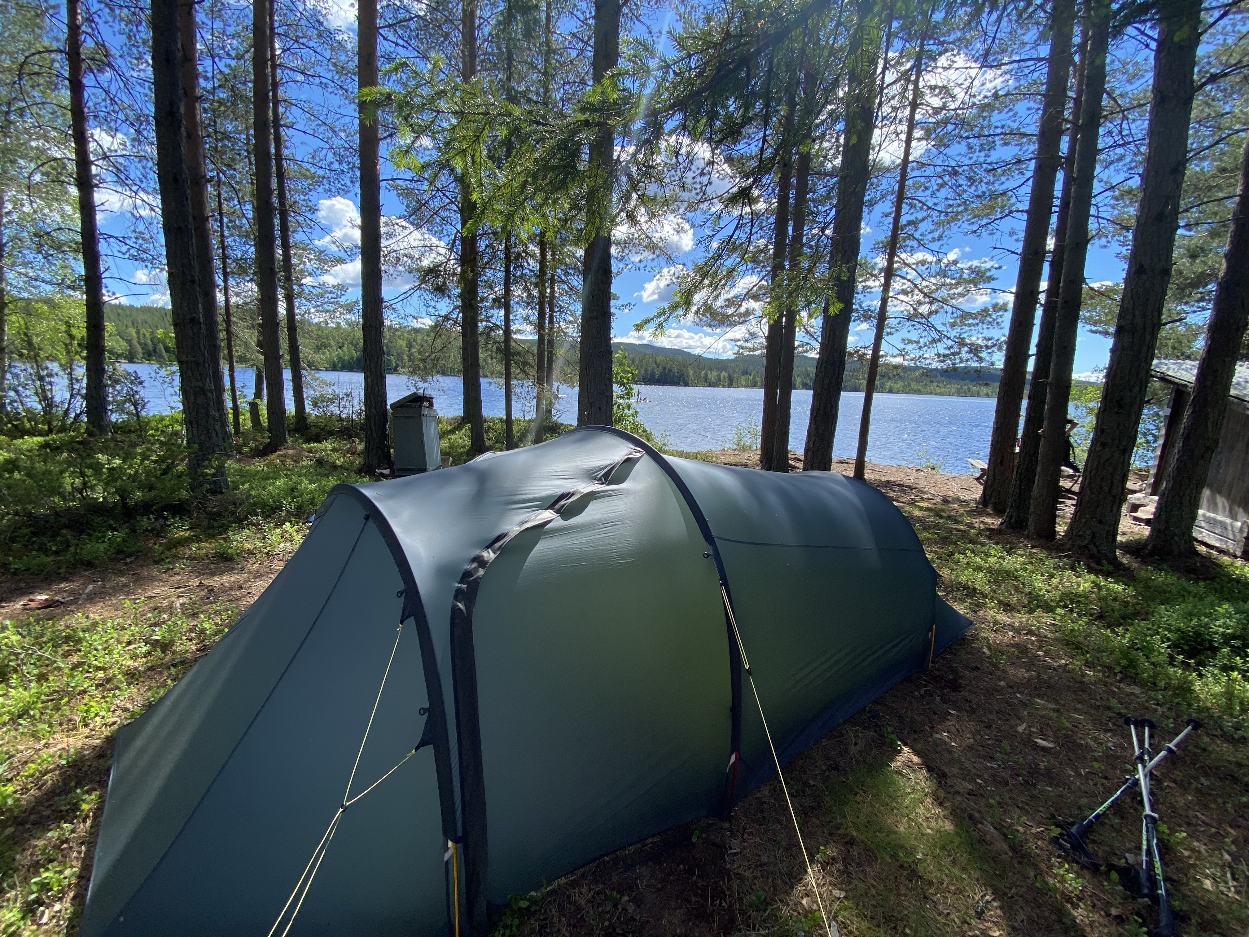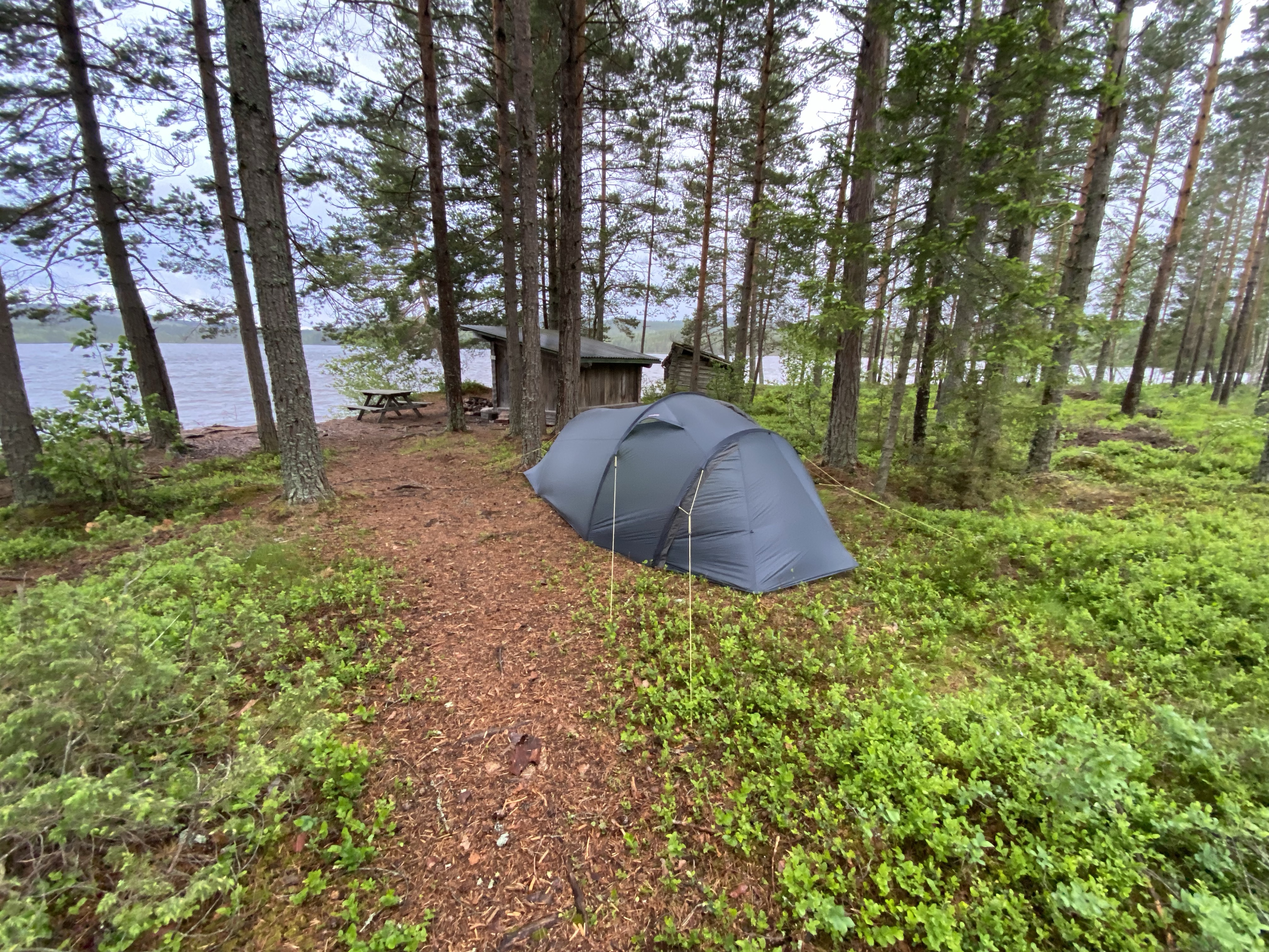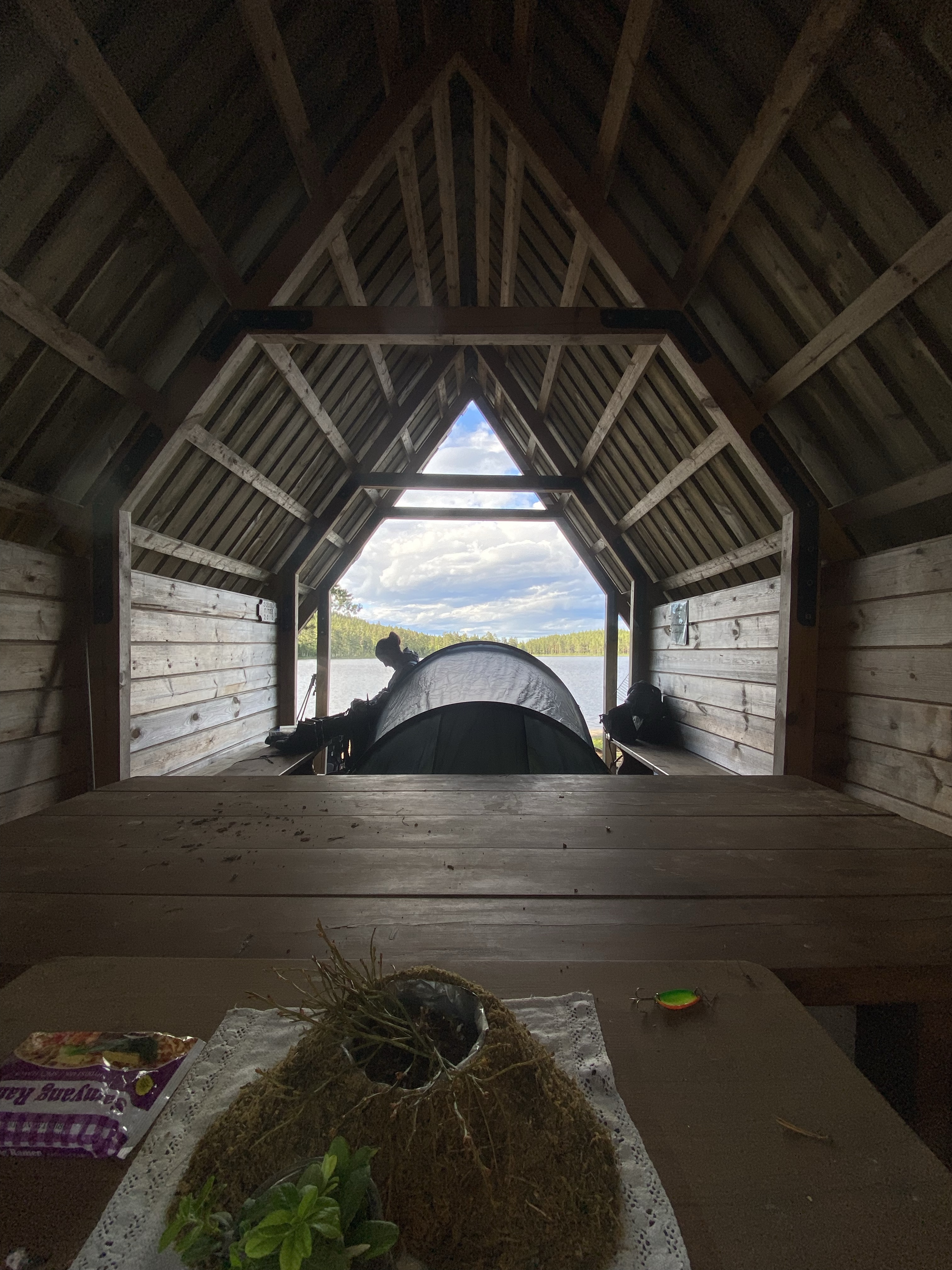 Der nächste Tag führte uns bergauf und bergab durch viel Matsch, endlose Wälder und über Almen bis sich unvermittelt die Sicht auf einen großen See auftat, an dem für die Nacht ein Shelter sein sollte. Wir freuten uns sehr, denn unsere Sehnsucht nach Weite und Fjell wuchs zusehends und so freuten wir uns besonders über den weiten Blick über den See und die angrenzenden Hügel. Der Shelter lag abseits der Wege, sehr idyllisch an der anderen Seeseite. Wir fanden direkt hinter dem Shelter einen schönen Zeltplatz und sogar die Mückenplage hielt sich aufgrund von ständigen Wind sehr zurück. Am späten Nachmittag kam noch ein Regenschauer durch, der aber zum Abend aufhörte.
