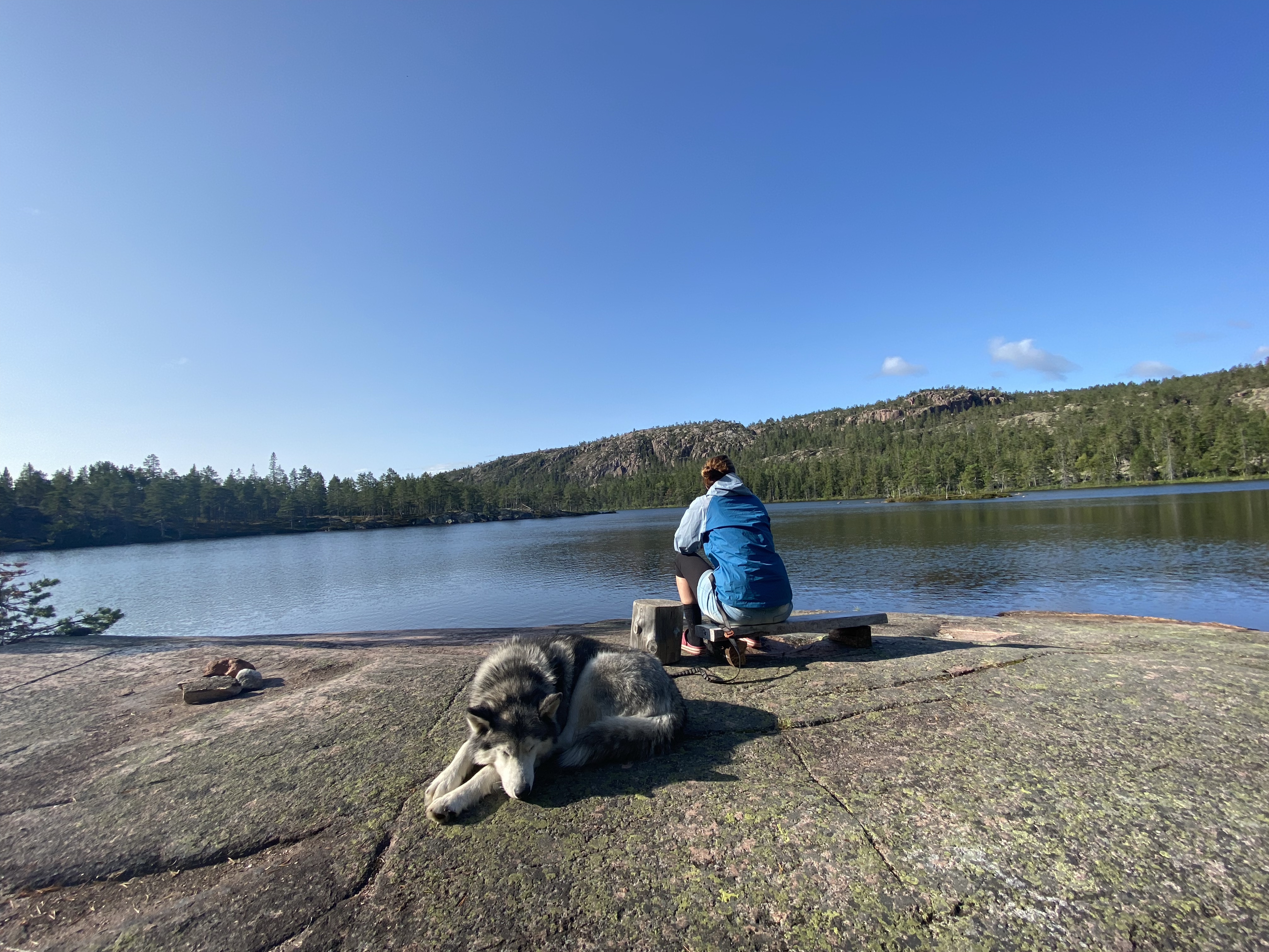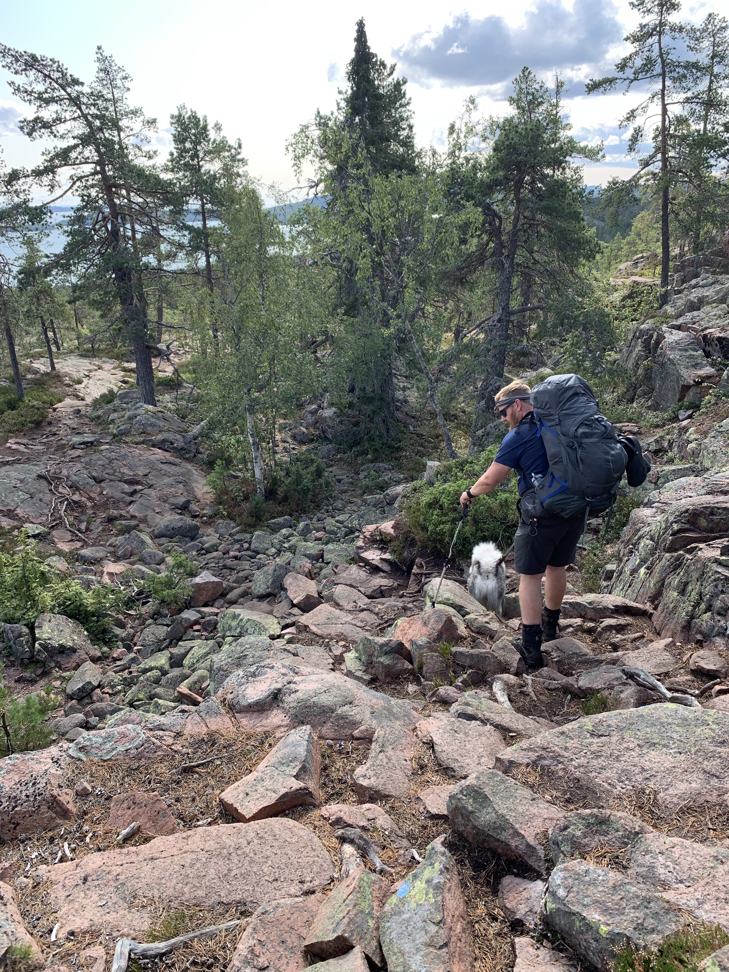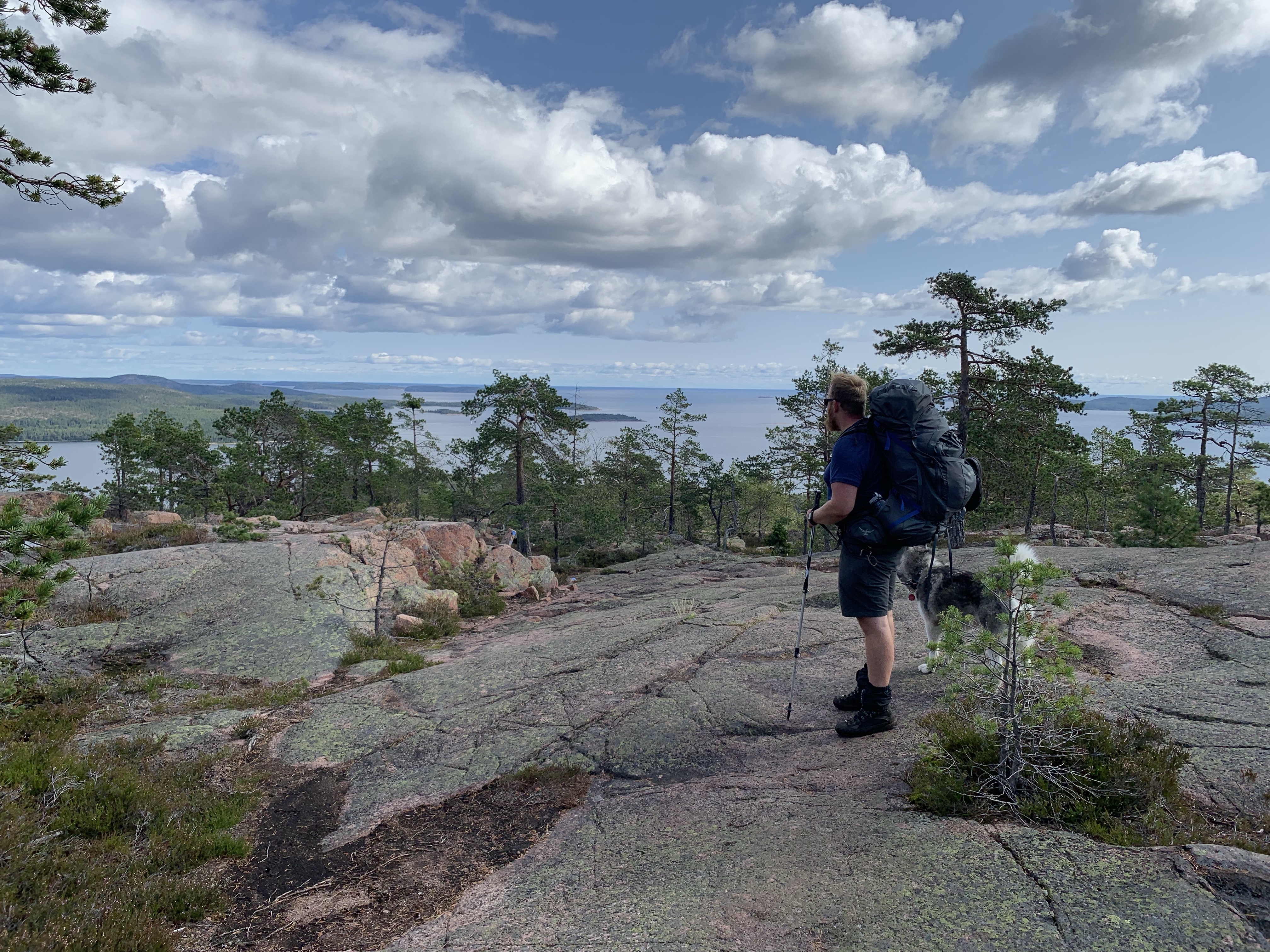 Die Lust auf eine Wanderung über mehrere Tage mit Rucksack und Zelt war nun wirklich groß. Also fuhren wir weiter gen Süden, parkten unser Auto in Hornöberget und machten uns auf den Höga Kustenleden. 130 Kilometer standen vor uns und nicht nur Mack freute sich sehr, dass es wieder los ging. Nach einem recht straßenlastigen Einstieg erwartete uns ein Wechselspiel als felsigen Steilküsten, Sandstränden, Wäldern, Mooren und dazu immer wieder Aussichtspunkte/Lichtungen, von denen wir den unfassbar weiten Blick auf das Meer mit seinen zahlreichen kleinen vorgelagerten Inseln genossen. Der Höga Kusten Leden hatte auch einige lange Straßenabschnitte dabei entlang von großen Feldern und Wiesen, aber es war irgendwie ein guter Mix von sehr unterschiedlichen Wegen. Wir sind den Höga Kusten Leden nicht komplett gelaufen, da Mack sich am Vorderbein an seinem neuen Rucksack großflächig wundgescheuert hatte und wir erst einmal eine Pause einlegten, damit seine Wunde heilen konnte. Recht schnell war klar, dass er seinen Rucksack erst einmal nicht mehr tragen kann und wir damit bei einer mehrtätigen Tour sein Futter für ihn tragen müssten. Da kommen schon ein paar Kilo Hundefutter zusammen. Geübt im Umplanen, schlossen wir das Buch Höga Kusten Leden und schoben zu einem späteren Zeitpunkt noch drei Wandertage im Nationalpark Skuleskogens, durch den der Höga Kusten zum Teil auch geht, ein. Und auch hier waren wir wieder von den Felsküsten, den Bäumen, die scheinbar ohne Probleme auf Steinen wachsen und den immer aus dem Nichts kommenden Weitblicken auf das Meer beeindruckt. Das „Berühmte“ an diesem Nationalpark ist eine enorm große Schlucht, die im Film Ronja Räubertochter vorkam und dadurch „berühmt“ wurde. Unabhängig von ihrem Bekanntheitsgrad war sie wirklich sehr beeindruckend. Man fühlt sich zwischen diesen riesengroßen Felsen so unglaublich klein und durchquert diese Schlucht mit einem irgendwie fast schon ehrfürchtigen Gefühl. Als wir sie durchquerten war es zudem schon später Nachmittag, sodass es recht frisch war und die Steine diese „Kälte“ auch zurückstrahlten. Es hatte etwas Mystisches oder vielleicht sogar ein stückweit auch Unheimliches. Nachdem wir gut über die vielen Steine in der Schlucht geklettert waren, landeten wir an einem wunderschönen See, an dem wir direkt einen Zeltplatz fanden, sogen noch die letzten Sonnenstrahlen in uns auf, bevor wir nach dem Abendessen müde und glücklich ins Zelt krochen. Am nächsten Tag ging es bei Sonnenschein und schöner Wanderwettertemperatur von 14 Grad über Felsen und Wurzeln wieder bergab, immer wieder mit Blick auf das Meer, bis wir die Küste erreichten und zwischen Sandbucht und Wald einen erneuten schönen Zeltplatz direkt am Meer fanden. Da es hier viele Stellplätze gab, war es hier recht voll im Vergleich zu sonst, aber dennoch konnten wir natürlich hier den Tag wunderbar ausklingen lassen bevor wir am nächsten Tag in den frühen Morgenstunden zurück zum Caddy wanderten. Es ist immer wieder schön und macht große Freude, gemeinsam neue Gegenden von Schweden zu entdecken.