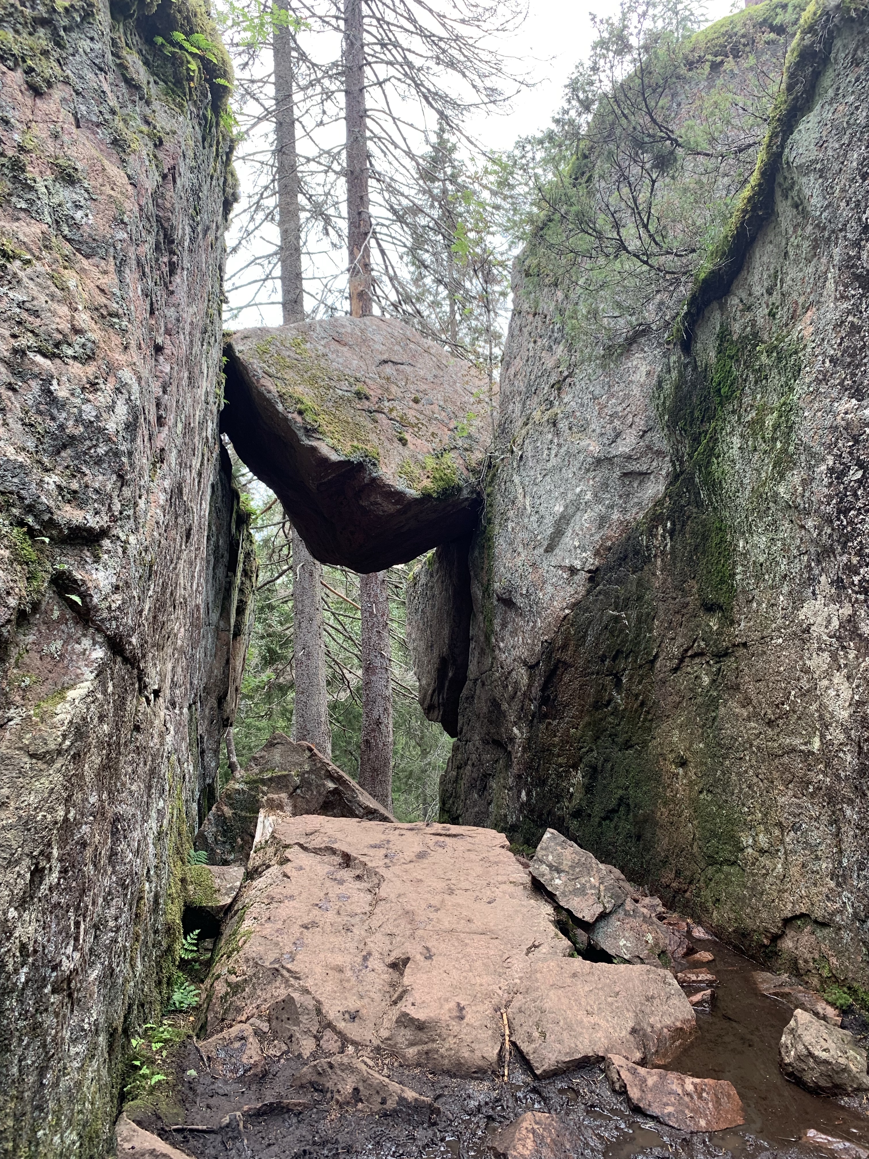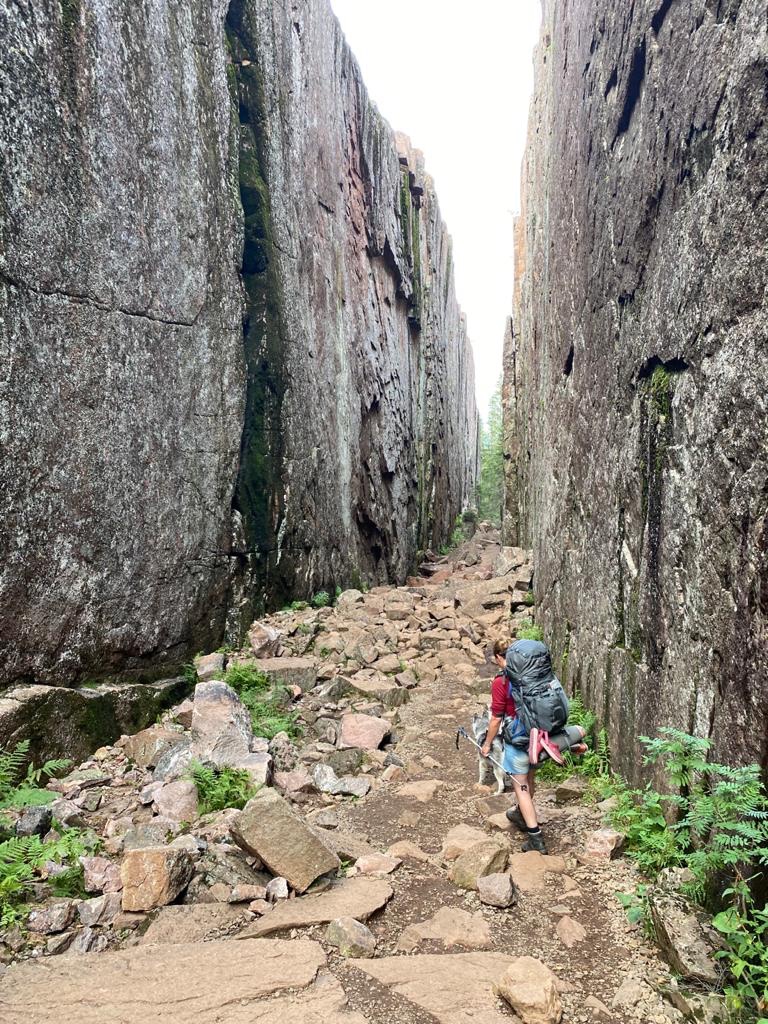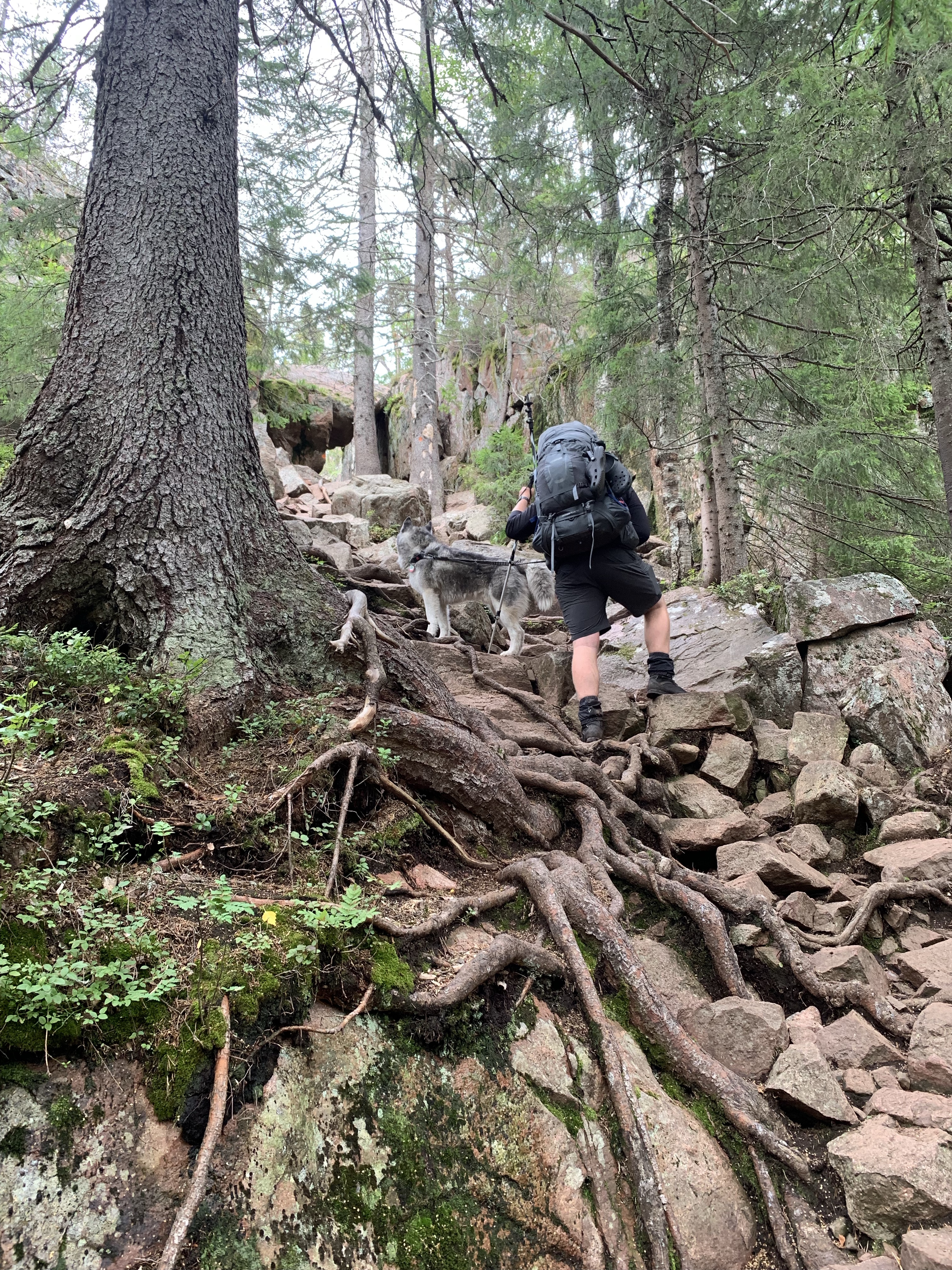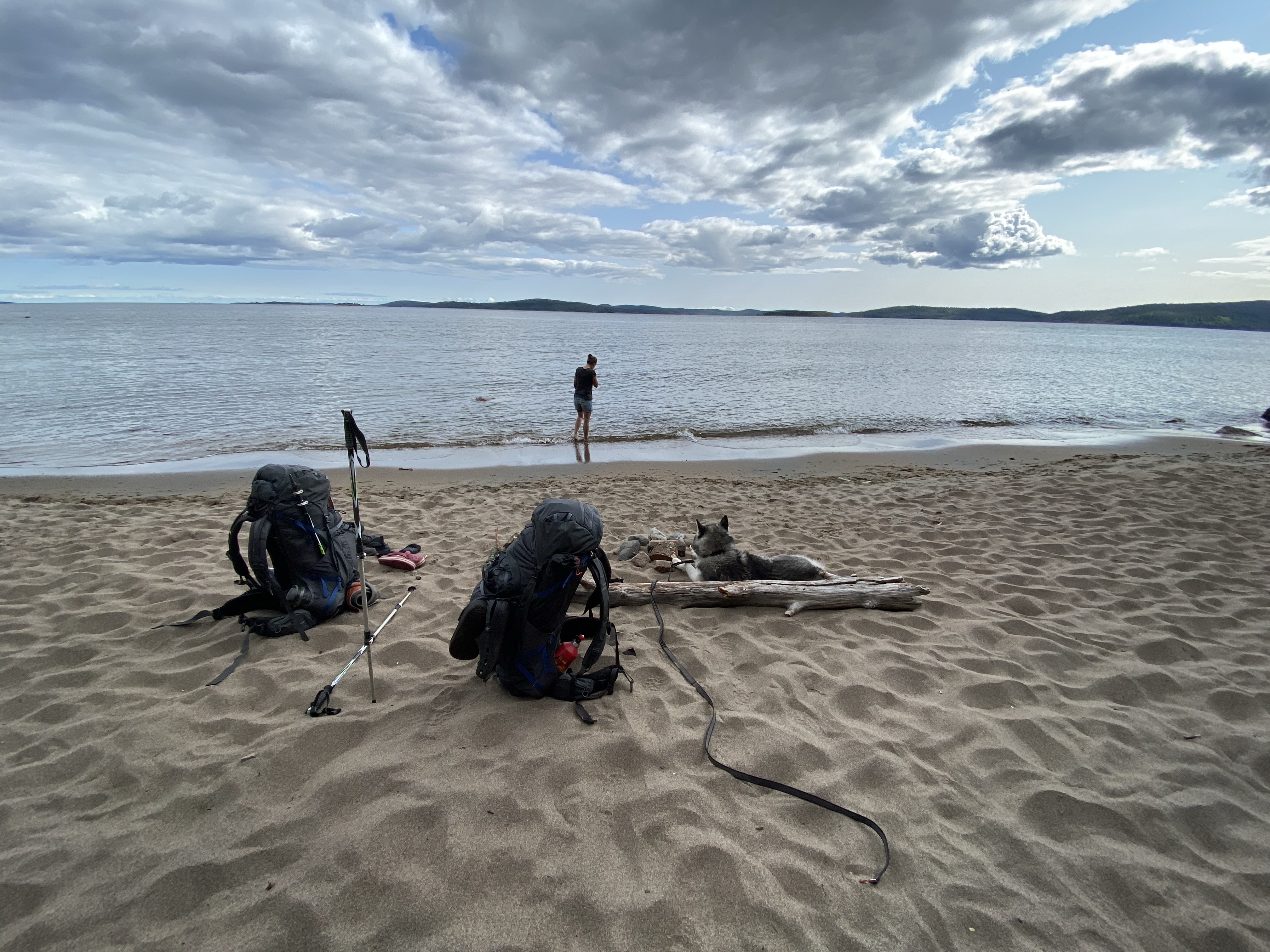 Die Lust auf eine Wanderung über mehrere Tage mit Rucksack und Zelt war nun wirklich groß. Also fuhren wir weiter gen Süden, parkten unser Auto in Hornöberget und machten uns auf den Höga Kustenleden. 130 Kilometer standen vor uns und nicht nur Mack freute sich sehr, dass es wieder los ging. Nach einem recht straßenlastigen Einstieg erwartete uns ein Wechselspiel als felsigen Steilküsten, Sandstränden, Wäldern, Mooren und dazu immer wieder Aussichtspunkte/Lichtungen, von denen wir den unfassbar weiten Blick auf das Meer mit seinen zahlreichen kleinen vorgelagerten Inseln genossen. Der Höga Kusten Leden hatte auch einige lange Straßenabschnitte dabei entlang von großen Feldern und Wiesen, aber es war irgendwie ein guter Mix von sehr unterschiedlichen Wegen. Wir sind den Höga Kusten Leden nicht komplett gelaufen, da Mack sich am Vorderbein an seinem neuen Rucksack großflächig wundgescheuert hatte und wir erst einmal eine Pause einlegten, damit seine Wunde heilen konnte. Recht schnell war klar, dass er seinen Rucksack erst einmal nicht mehr tragen kann und wir damit bei einer mehrtätigen Tour sein Futter für ihn tragen müssten. Da kommen schon ein paar Kilo Hundefutter zusammen. Geübt im Umplanen, schlossen wir das Buch Höga Kusten Leden und schoben zu einem späteren Zeitpunkt noch drei Wandertage im Nationalpark Skuleskogens, durch den der Höga Kusten zum Teil auch geht, ein. Und auch hier waren wir wieder von den Felsküsten, den Bäumen, die scheinbar ohne Probleme auf Steinen wachsen und den immer aus dem Nichts kommenden Weitblicken auf das Meer beeindruckt. Das „Berühmte“ an diesem Nationalpark ist eine enorm große Schlucht, die im Film Ronja Räubertochter vorkam und dadurch „berühmt“ wurde. Unabhängig von ihrem Bekanntheitsgrad war sie wirklich sehr beeindruckend. Man fühlt sich zwischen diesen riesengroßen Felsen so unglaublich klein und durchquert diese Schlucht mit einem irgendwie fast schon ehrfürchtigen Gefühl. Als wir sie durchquerten war es zudem schon später Nachmittag, sodass es recht frisch war und die Steine diese „Kälte“ auch zurückstrahlten. Es hatte etwas Mystisches oder vielleicht sogar ein stückweit auch Unheimliches. Nachdem wir gut über die vielen Steine in der Schlucht geklettert waren, landeten wir an einem wunderschönen See, an dem wir direkt einen Zeltplatz fanden, sogen noch die letzten Sonnenstrahlen in uns auf, bevor wir nach dem Abendessen müde und glücklich ins Zelt krochen. Am nächsten Tag ging es bei Sonnenschein und schöner Wanderwettertemperatur von 14 Grad über Felsen und Wurzeln wieder bergab, immer wieder mit Blick auf das Meer, bis wir die Küste erreichten und zwischen Sandbucht und Wald einen erneuten schönen Zeltplatz direkt am Meer fanden. Da es hier viele Stellplätze gab, war es hier recht voll im Vergleich zu sonst, aber dennoch konnten wir natürlich hier den Tag wunderbar ausklingen lassen bevor wir am nächsten Tag in den frühen Morgenstunden zurück zum Caddy wanderten. Es ist immer wieder schön und macht große Freude, gemeinsam neue Gegenden von Schweden zu entdecken.