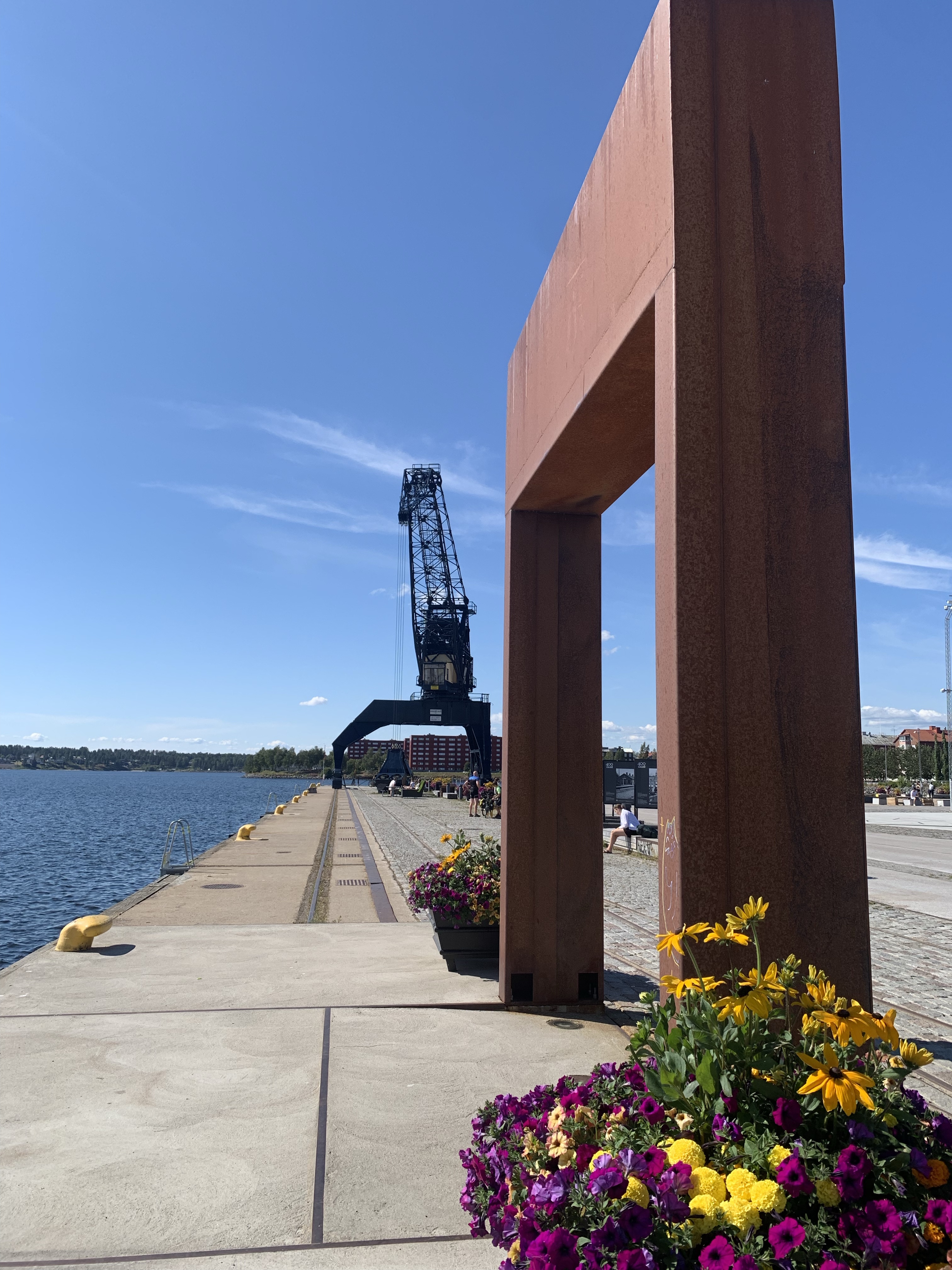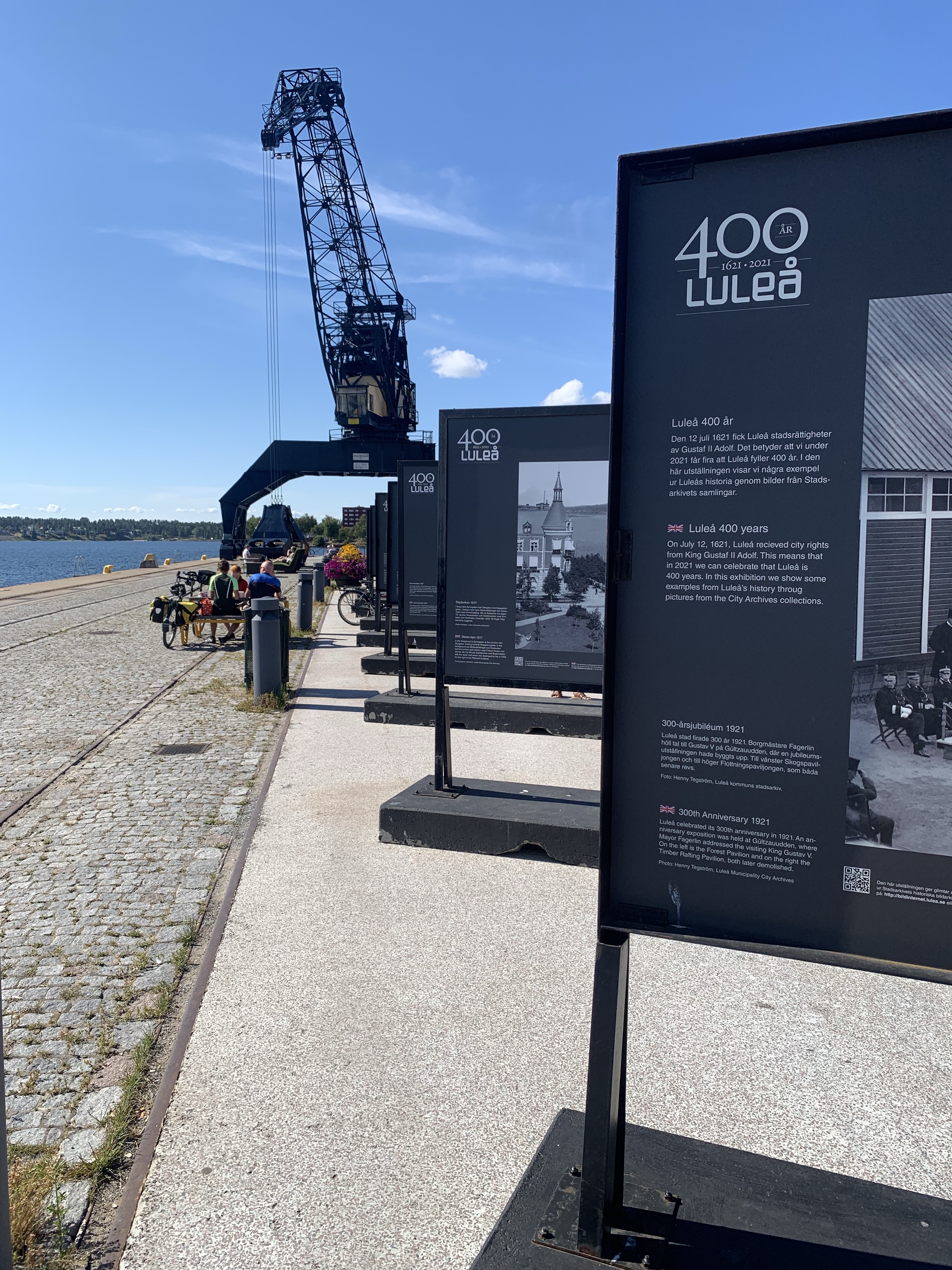 Wir erlebten Luleå bei strahlendem Sonnenschein und während Tobi einige Outdoorläden unsicher machte, genoss ich mit Mack die Hafenatmosphäre und schlenderte an den Geschichtstafeln zum 400.-jährigen Jubiläum von Luleå entlang. In der Ferne lagen die riesengroßen Eisbrecher für die Winterzeit schon bereit und ich konnte mir bei dem schönen Wetter schwer vorstellen, wie hier irgendwann alles so kalt und mit dicken Eisschichten zugefroren ist, dass ihr Einsatz notwendig ist. Auf einem kleinen Platz neben der Promenade waren einige kleine Buden mit Leckereien aufgebaut, es gab einen großen Kinder- und Wasserspielplatz und viele sehr bunt bestückte, große Blumenkübel. Es wirkte auf mich irgendwie alles sehr schön bunt, froh und harmonisch, sodass ich uns einen Platz suchte, für mich in der Sonne und für Mack im Schatten, und dem bunten Treiben einfach entspannt zusah, bis Tobi von seiner Shoppingtour erfolgreich und zufrieden zurückkam.