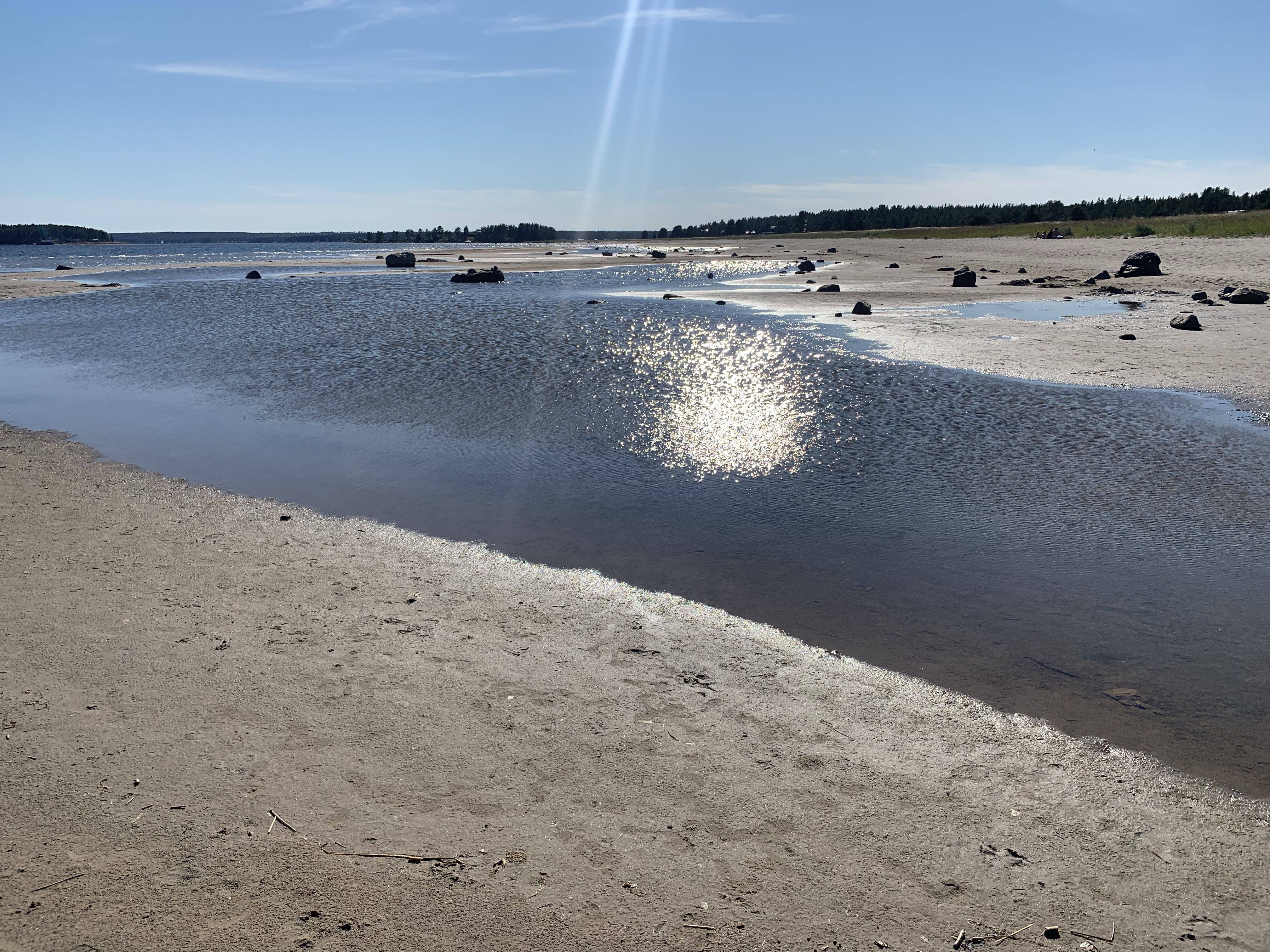 Einen Tag später ging es dann noch weiter gen Süden: nach Piteå bzw. in das nahegelegende Naturreservat Sandängesstranden. Wie der Name schon vermuten lässt, gibt es hier kilometerlange Sandstrände und unzählige Spazier- und Wanderwege auf sandigem Boden durch pure Kiefernwälder. Begleitet von dem intensiven Kiefernadelgeruch spazierten wir ein wenig kreuz und quer durch das Naturschutzgebiet bis wir zum Meer gingen. Am Wasser wechselte der Geruch dann sofort in den bekannten „Meersalzgeruch“ inklusive steifer Brise, sodass hier schon viel mehr ein „Meerfeeling“ aufkam als in Luleå. Viele Schweden waren an dem sonnigen Tag trotz Wind hier vor Ort und hatten sich in den kleinen Dünenfelder ein windgeschütztes Eckchen gesucht, um Sonne zu tanken. Eine sehr gemütliche, entspannte Atmosphäre, aber wir genossen es mehr, ein wenig am Wasser entlangzuschlendern und hier das Gesicht in die Sonne zu halten. Muscheln sucht man hier oben an den Stränden übrigens vergebens, so war mein Eindruck, aber dafür gibt es viele bunte und unterschiedlich geformte Steine.