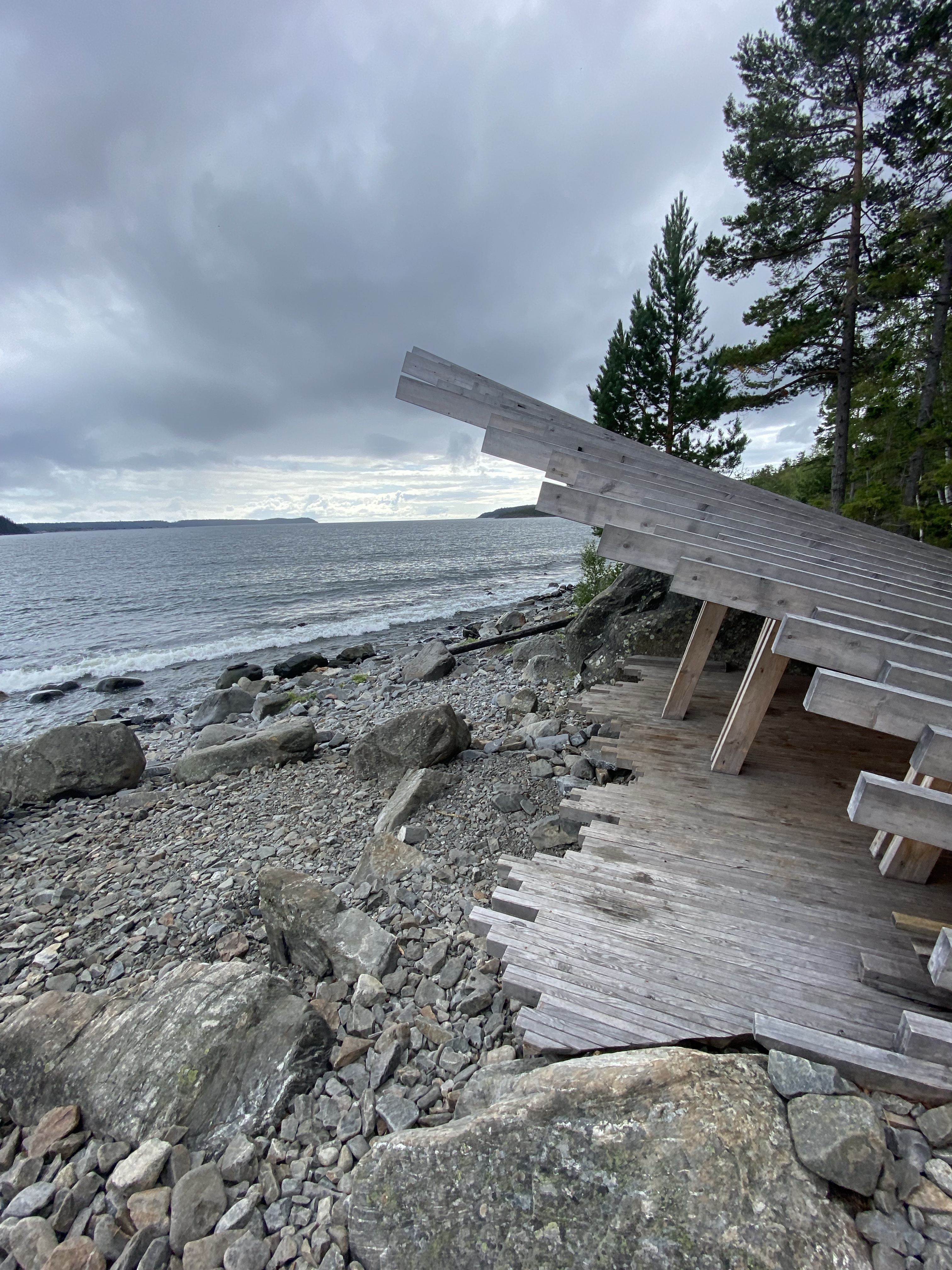 Auf dem Weg von Piteå nach Umeå entdeckten wir per Zufall eine mega schöne Strandbucht bei Lövånger. Als wir ankamen hatten wir lange Zeit einen kleinen Ministrand nur für uns allein, konnten die Solardusche in einen Baum hängen und entspannt duschen und es kam ein wunderbares Urlaubsgefühl auf. Bei der Wanderung selbst ist es ja nicht wirklich ein Urlaub, auch wenn man arbeitsfrei hat, sondern es ist mehr eine Reise oder eben ein Abenteuer, das mit Urlaubsmomenten gespickt ist. So oder so, dieser Ort hatte es uns einfach angetan und so blieben wir statt einer Nacht drei Nächte, um uns erst dann weiter Richtung Süden aufzumachen, da der Plan ja eigentlich war, den Högen Kusten Leden zu wandern. In dieser Bucht war es wirklich wie am Meer. Nicht nur, weil Segelschiffe und in ganz, ganz weiter Ferne auch Fähren oder Frachter vorbeifuhren, sondern auch weil es hier hellen Sandstrand gab, glasklares Salzwasser und stets immer eine kleine oder große Brise. Wunderbar an dieser Bucht war auch, dass es unfassbar viele Himbeeren gab. Sie waren sehr klein, aber zuckersüß und einfach lecker. Einige kleine Wanderungen machten wir hier auch und waren sehr angetan von den felsigen Wegen entlang der Küste, die immer wieder durch kleine Wald- oder Moorabschnitte unterbrochen wurden. Besonders an diesen kleinen Wanderungen war auch, dass auf einmal im Grunde im „nichts“ Schilder mit historischen Erklärungen standen. So wurde auf alte Wikingerbehausungen verwiesen oder Steinöfen der russischen Flotte oder Unterkünfte von früheren Robbenjägern. Manchmal konnten wir die Grundrisse dieser Steinbauten noch erkennen, manchmal war es jedoch eher nur ein „Steinhaufen“, der viel kreative Vorstellungskraft erforderte. Auf jeden Fall war es immer eine Bereicherung für die Wanderung.